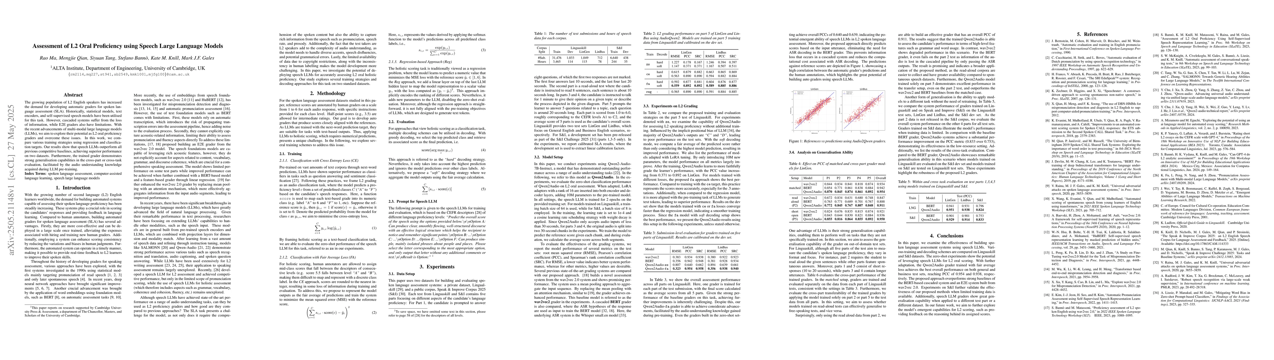 This research paper explores using large language models for assessing L2 oral proficiency, outperforming previous baselines with superior performance on two datasets, and demonstrating strong generalization capabilities.