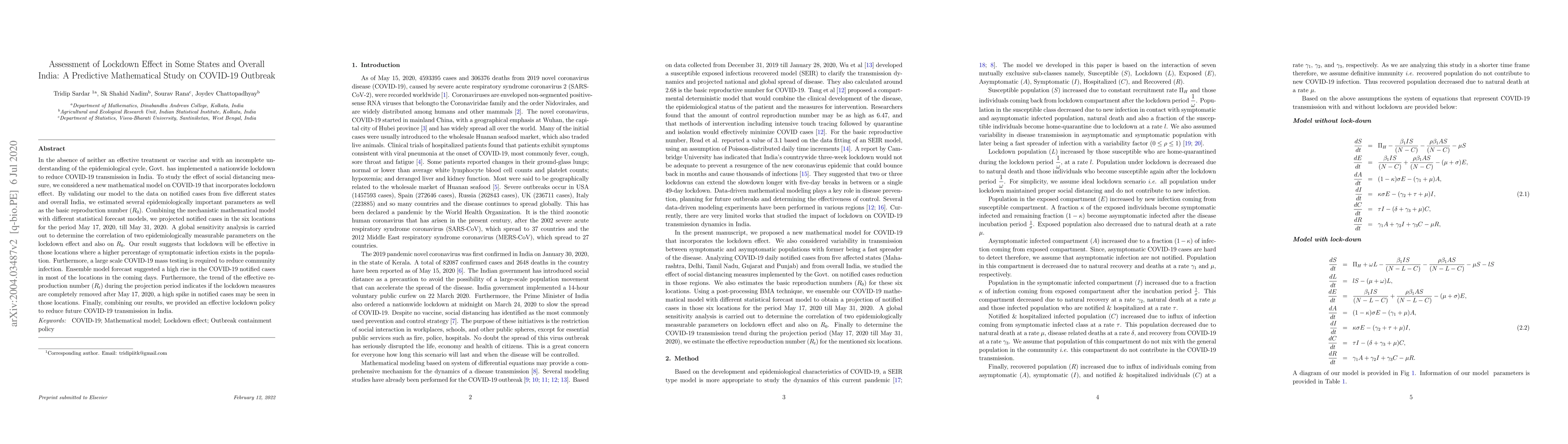 In the absence of neither an effective treatment or vaccine and with an incomplete understanding of the epidemiological cycle, Govt. has implemented a nationwide lockdown to reduce COVID-19 transmission in India. To study the effect of social distancing measure, we considered a new mathematical model on COVID-19 that incorporates lockdown effect. By validating our model to the data on notified cases from five different states and overall India, we estimated several epidemiologically important parameters as well as the basic reproduction number ($R_{0}$). Combining the mechanistic mathematical model with different statistical forecast models, we projected notified cases in the six locations for the period May 17, 2020, till May 31, 2020. A global sensitivity analysis is carried out to determine the correlation of two epidemiologically measurable parameters on the lockdown effect and also on $R_{0}$. Our result suggests that lockdown will be effective in those locations where a higher percentage of symptomatic infection exists in the population. Furthermore, a large scale COVID-19 mass testing is required to reduce community infection. Ensemble model forecast suggested a high rise in the COVID-19 notified cases in most of the locations in the coming days. Furthermore, the trend of the effective reproduction number ($R_{t}$) during the projection period indicates if the lockdown measures are completely removed after May 17, 2020, a high spike in notified cases may be seen in those locations. Finally, combining our results, we provided an effective lockdown policy to reduce future COVID-19 transmission in India.