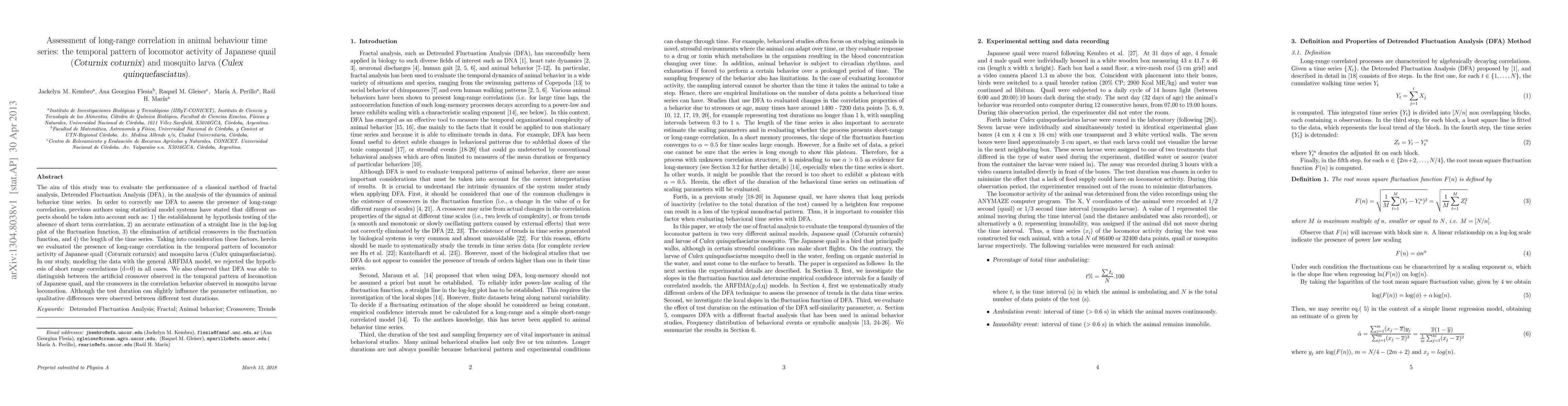 The aim of this study was to evaluate the performance of a classical method of fractal analysis, Detrended Fluctuation Analysis (DFA), in the analysis of the dynamics of animal behavior time series. In order to correctly use DFA to assess the presence of long-range correlation, previous authors using statistical model systems have stated that different aspects should be taken into account such as: 1) the establishment by hypothesis testing of the absence of short term correlation, 2) an accurate estimation of a straight line in the log-log plot of the fluctuation function, 3) the elimination of artificial crossovers in the fluctuation function, and 4) the length of the time series. Taking into consideration these factors, herein we evaluated the presence of long-range correlation in the temporal pattern of locomotor activity of Japanese quail ({\sl Coturnix coturnix}) and mosquito larva ({\sl Culex quinquefasciatus}). In our study, modeling the data with the general ARFIMA model, we rejected the hypothesis of short range correlations (d=0) in all cases. We also observed that DFA was able to distinguish between the artificial crossover observed in the temporal pattern of locomotion of Japanese quail, and the crossovers in the correlation behavior observed in mosquito larvae locomotion. Although the test duration can slightly influence the parameter estimation, no qualitative differences were observed between different test durations.