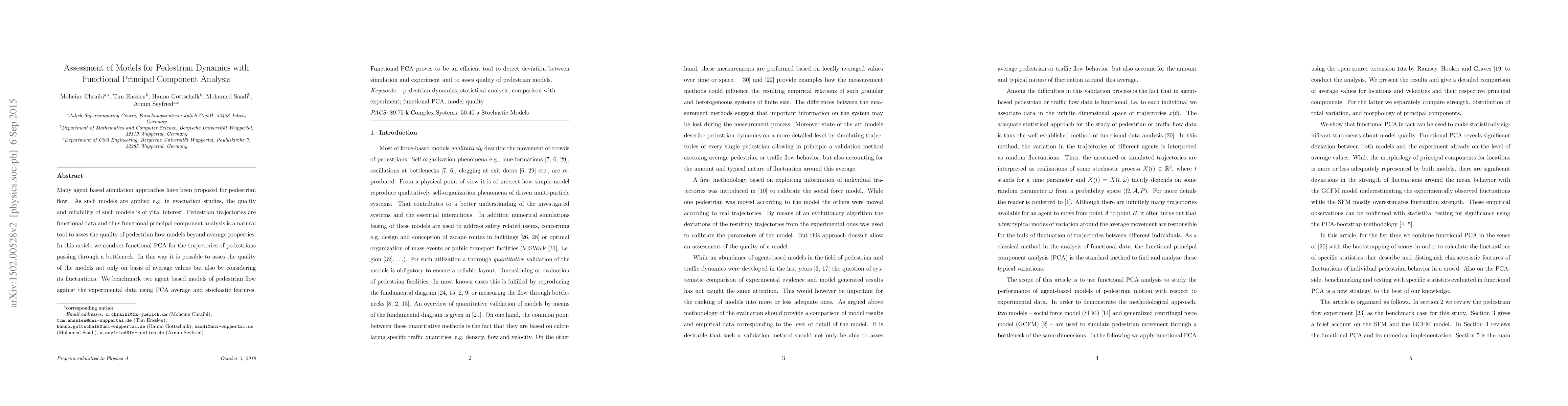This paper assesses the quality of two agent-based pedestrian flow models using functional principal component analysis (PCA) on experimental pedestrian trajectories. Functional PCA reveals significant deviations between simulation and real-world data, demonstrating its effectiveness in evaluating pedestrian dynamics models.