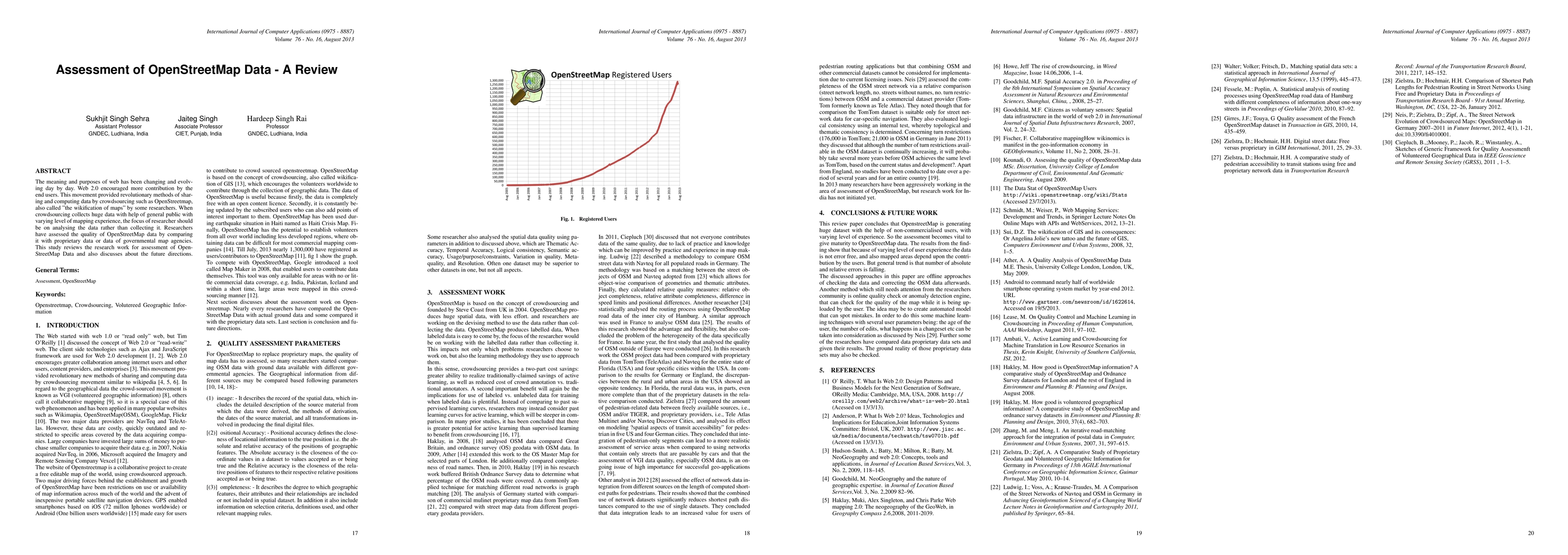The meaning and purposes of web has been changing and evolving day by day. Web 2. 0 encouraged more contribution by the end users. This movement provided revolutionary methods of sharing and computing data by crowdsourcing such as OpenStreetmap, also called "the wikification of maps" by some researchers. When crowdsourcing collects huge data with help of general public with varying level of mapping experience, the focus of researcher should be on analysing the data rather than collecting it. Researchers have assessed the quality of OpenStreetMap data by comparing it with proprietary data or data of governmental map agencies. This study reviews the research work for assessment of Open- StreetMap Data and also discusses about the future directions.
