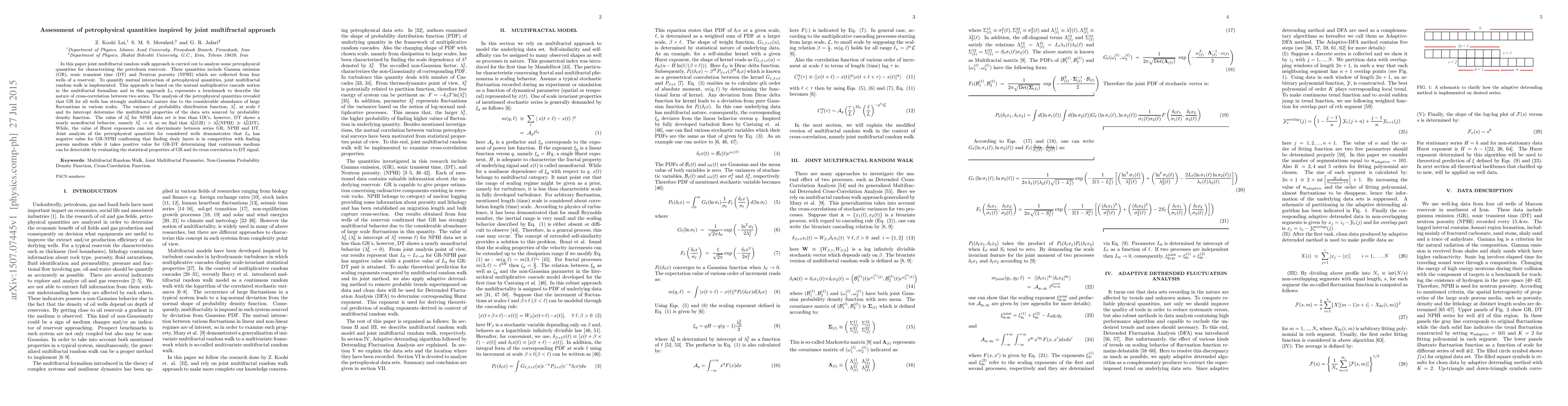 In this paper joint multifractal random walk approach is carried out to analyze some petrophysical quantities for characterizing the petroleum reservoir. These quantities include Gamma emission (GR), sonic transient time (DT) and Neutron porosity (NPHI) which are collected from four wells of a reservoir. To quantify mutual interaction of petrophysical quantities, joint multifractal random walk is implemented. This approach is based on the mutual multiplicative cascade notion in the multifractal formalism and in this approach $L_0$ represents a benchmark to describe the nature of cross-correlation between two series. The analysis of the petrophysical quantities revealed that GR for all wells has strongly multifractal nature due to the considerable abundance of large fluctuations in various scales. The variance of probability distribution function, $\lambda_{\ell}^2$, at scale $\ell$ and its intercept determine the multifractal properties of the data sets sourced by probability density function. The value of $\lambda_0 ^2$ for NPHI data set is less than GR's, however, DT shows a nearly monofractal behavior, namely $\lambda_0 ^2\rightarrow 0$, so we find that $\lambda_0^2({\rm GR})>\lambda_0^2({\rm NPHI})\gg\lambda_0^2({\rm DT})$. While, the value of Hurst exponents can not discriminate between series GR, NPHI and DT. Joint analysis of the petrophysical quantities for considered wells demonstrates that $L_0$ has negative value for GR-NPHI confirming that finding shaly layers is in competition with finding porous medium while it takes positive value for GR-DT determining that continuum medium can be detectable by evaluating the statistical properties of GR and its cross-correlation to DT signal.
