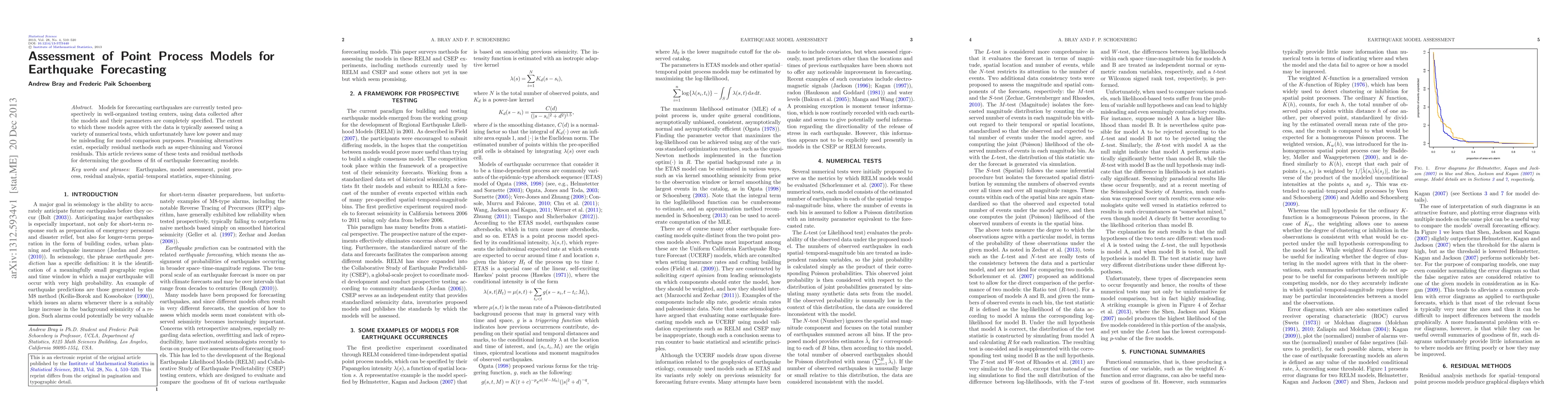 Models for forecasting earthquakes are currently tested prospectively in well-organized testing centers, using data collected after the models and their parameters are completely specified. The extent to which these models agree with the data is typically assessed using a variety of numerical tests, which unfortunately have low power and may be misleading for model comparison purposes. Promising alternatives exist, especially residual methods such as super-thinning and Voronoi residuals. This article reviews some of these tests and residual methods for determining the goodness of fit of earthquake forecasting models.