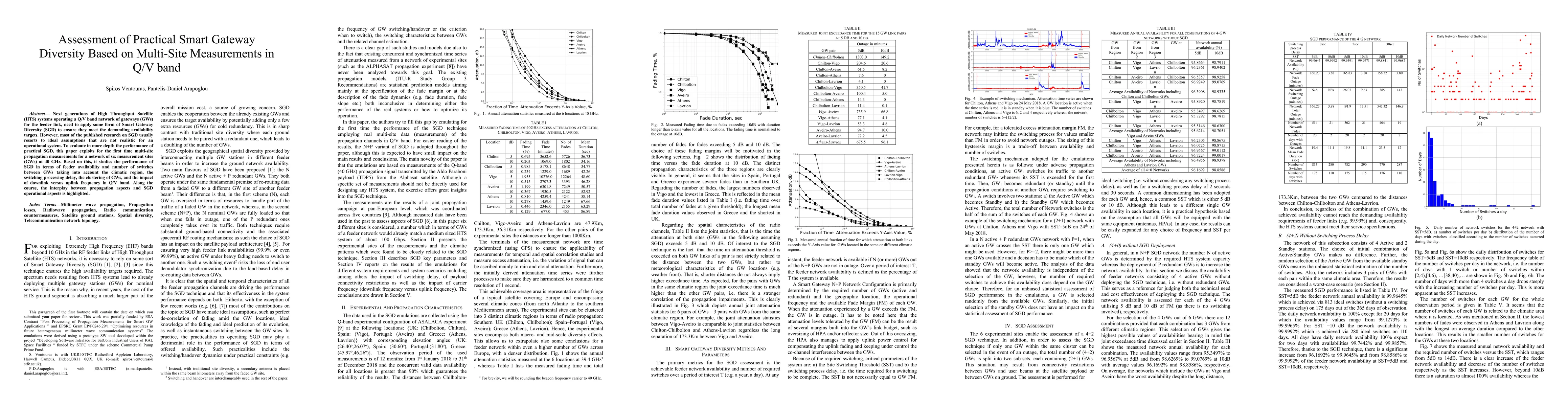 Next generations of High Throughput Satellite (HTS) systems operating a Q/V band network of gateways (GWs) for the feeder link, need to apply some form of Smart Gateway Diversity (SGD) to ensure they meet the demanding availability targets. However, most of the published research on SGD usually resorts to ideal assumptions that are not realistic for an operational system. To evaluate in more depth the performance of practical SGD, this paper exploits for the first time multi-site propagation measurements for a network of six measurement sites (GWs) at 40 GHz. Based on this, it studies the performance of SGD in terms of feeder availability and number of switches between GWs taking into account the climatic region, the switching processing delay, the clustering of GWs, and the impact of downlink versus uplink frequency in Q/V band. Along the course, the interplay between propagation aspects and SGD operational aspects is highlighted.