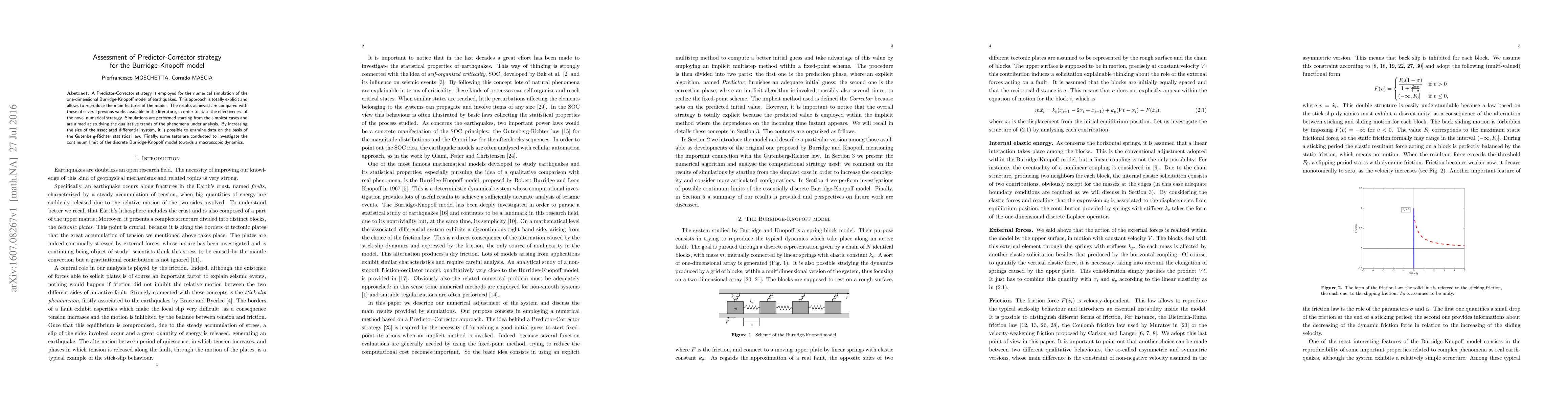 This paper assesses a Predictor-Corrector strategy for simulating the one-dimensional Burridge-Knopoff earthquake model, demonstrating its ability to reproduce key features. The approach is compared with previous methods to validate its effectiveness, and simulations explore the Gutenberg-Richter law and the continuum limit of the model.