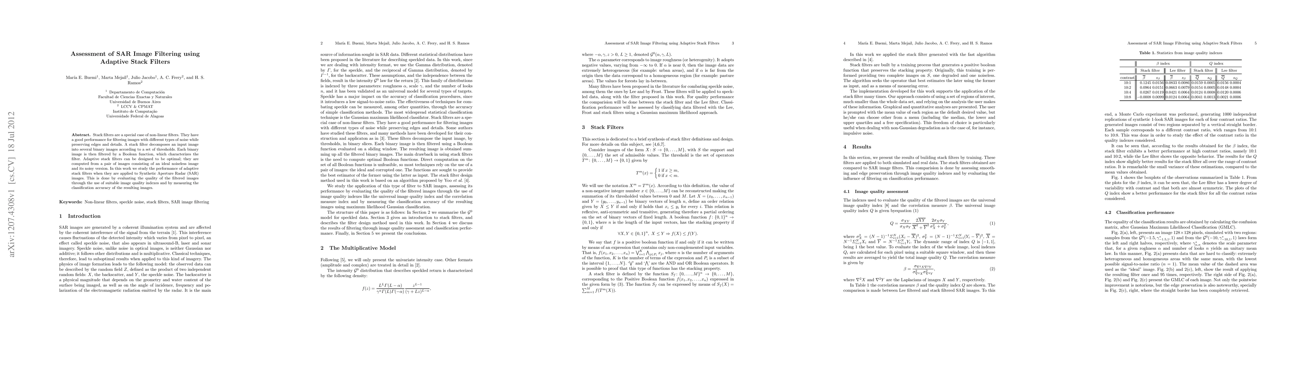 This paper evaluates the performance of adaptive stack filters in processing Synthetic Aperture Radar (SAR) images, assessing their effectiveness through image quality metrics and classification accuracy. The study highlights the filters' ability to preserve image details while reducing noise.