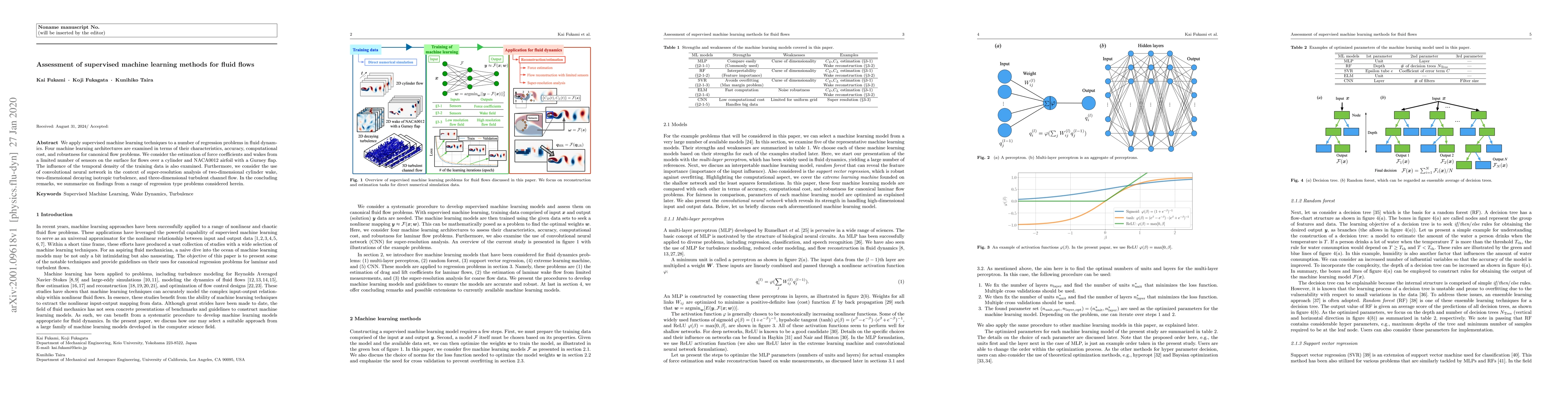This paper evaluates four supervised machine learning methods for predicting fluid flow characteristics, focusing on accuracy, computational cost, and robustness. It examines force coefficient estimation and wake analysis for flows over a cylinder and airfoil, and explores convolutional neural networks for enhanced resolution in turbulence simulations.
