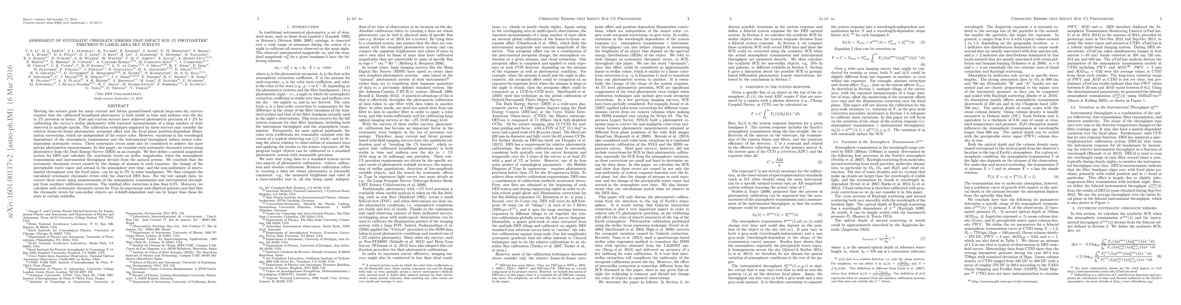 Meeting the science goals for many current and future ground-based optical large-area sky surveys requires that the calibrated broadband photometry is stable in time and uniform over the sky to 1% precision or better. Past surveys have achieved photometric precision of 1-2% by calibrating the survey's stellar photometry with repeated measurements of a large number of stars observed in multiple epochs. The calibration techniques employed by these surveys only consider the relative frame-by-frame photometric zeropoint offset and the focal plane position-dependent illumination corrections, which are independent of the source color. However, variations in the wavelength dependence of the atmospheric transmission and the instrumental throughput induce source color-dependent systematic errors. These systematic errors must also be considered to achieve the most precise photometric measurements. In this paper, we examine such systematic chromatic errors using photometry from the Dark Energy Survey (DES) as an example. We define a natural magnitude system for DES and calculate the systematic errors on stellar magnitudes, when the atmospheric transmission and instrumental throughput deviate from the natural system. We conclude that the systematic chromatic errors caused by the change of airmass in each exposure, the change of the precipitable water vapor and aerosol in the atmosphere over time, and the non-uniformity of instrumental throughput over the focal plane, can be up to 2% in some bandpasses. We compare the calculated systematic chromatic errors with the observed DES data. For the test sample data, we correct these errors using measurements of the atmospheric transmission and instrumental throughput. The residual after correction is less than 0.3%. We also find that the errors for non-stellar objects are redshift-dependent and can be larger than those for stars at certain redshifts.