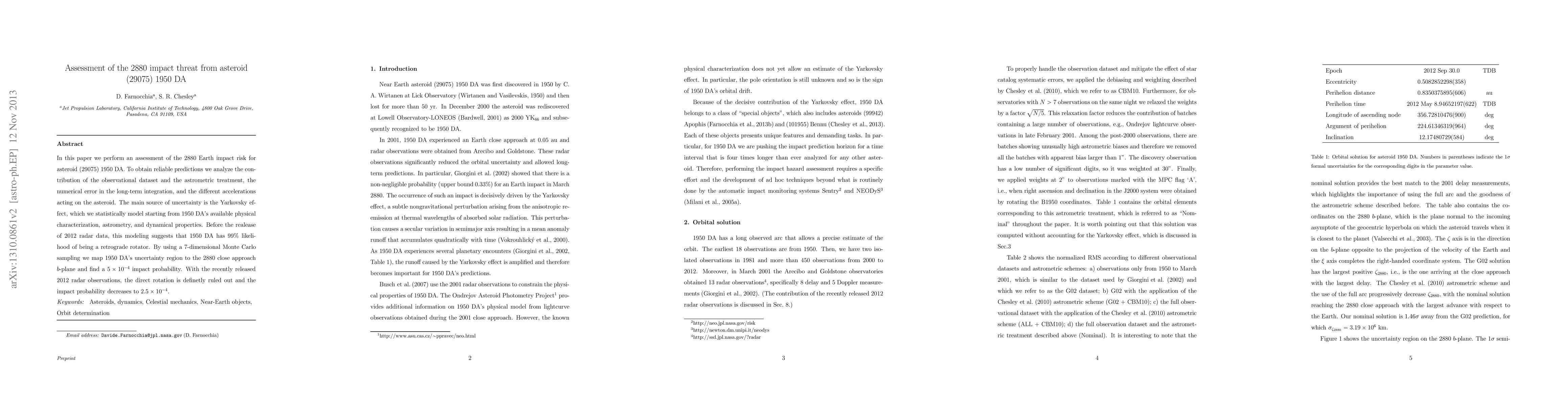 This paper assesses the Earth impact risk for asteroid (29075) 1950 DA in 2880, finding a 5 x 10^-4 probability before 2012 radar data, which ruled out direct rotation and reduced the probability to 2.5 x 10^-4. The main uncertainty stems from the Yarkovsky effect.