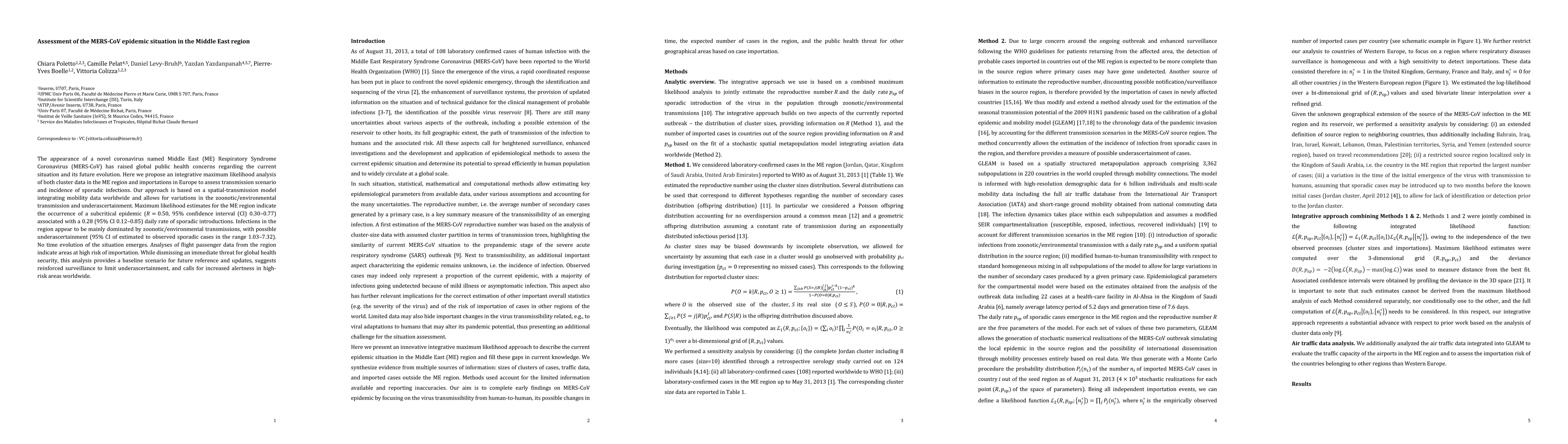 The appearance of a novel coronavirus named Middle East (ME) Respiratory Syndrome Coronavirus (MERS-CoV) has raised global public health concerns regarding the current situation and its future evolution. Here we propose an integrative maximum likelihood analysis of both cluster data in the ME region and importations in Europe to assess transmission scenario and incidence of sporadic infections. Our approach is based on a spatial-transmission model integrating mobility data worldwide and allows for variations in the zoonotic/environmental transmission and underascertainment. Maximum likelihood estimates for the ME region indicate the occurrence of a subcritical epidemic (R=0.50, 95% confidence interval (CI) 0.30-0.77) associated with a 0.28 (95% CI 0.12-0.85) daily rate of sporadic introductions. Infections in the region appear to be mainly dominated by zoonotic/environmental transmissions, with possible underascertainment (95% CI of estimated to observed sporadic cases in the range 1.03-7.32). No time evolution of the situation emerges. Analyses of flight passenger data from the region indicate areas at high risk of importation. While dismissing an immediate threat for global health security, this analysis provides a baseline scenario for future reference and updates, suggests reinforced surveillance to limit underascertainment, and calls for increased alertness in high-risk areas worldwide.