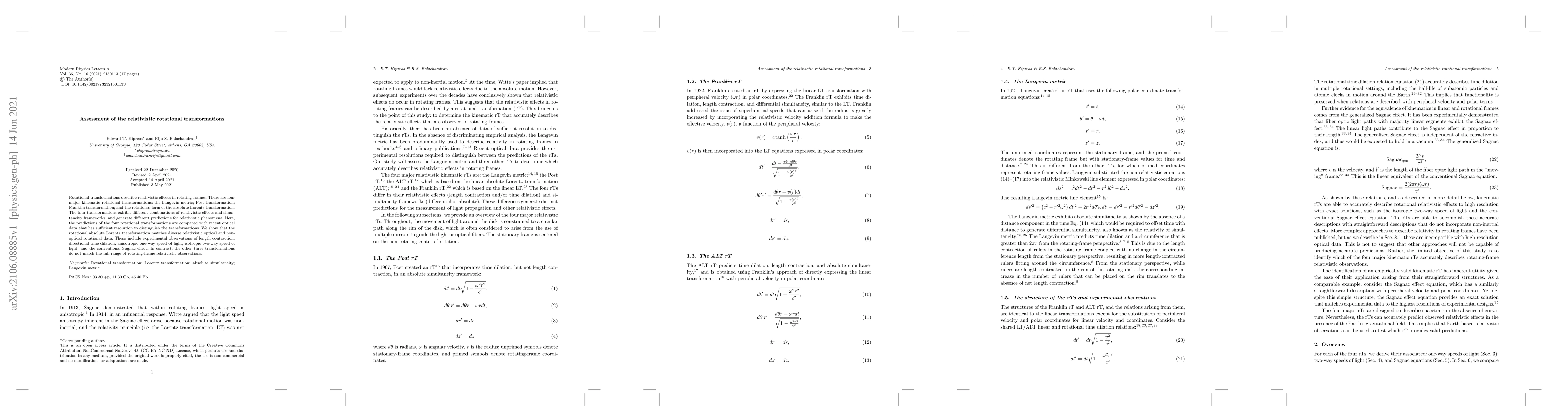This paper assesses four major relativistic rotational transformations, comparing their predictions against recent high-resolution optical data. The rotational absolute Lorentz transformation aligns with diverse experimental observations, while the other three transformations fail to match the full spectrum of rotating-frame relativistic phenomena.