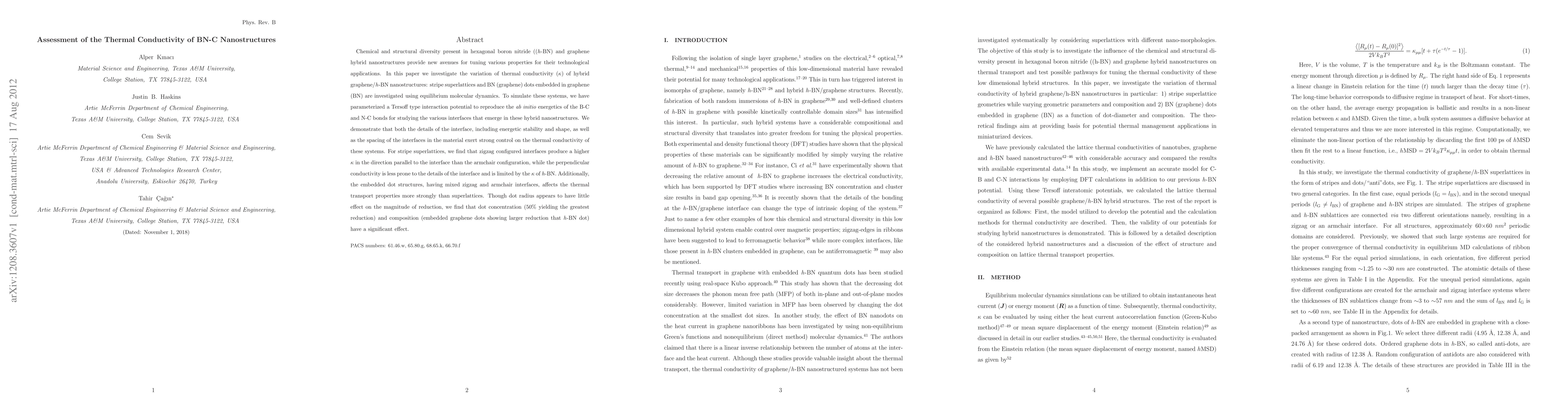 This paper investigates the thermal conductivity of hybrid graphene/h-BN nanostructures using equilibrium molecular dynamics, finding that interface details and spacing strongly influence thermal conductivity. Zigzag interfaces in stripe superlattices enhance parallel conductivity while dot structures with mixed interfaces significantly reduce thermal transport, with higher dot concentration and graphene composition yielding greater reductions.