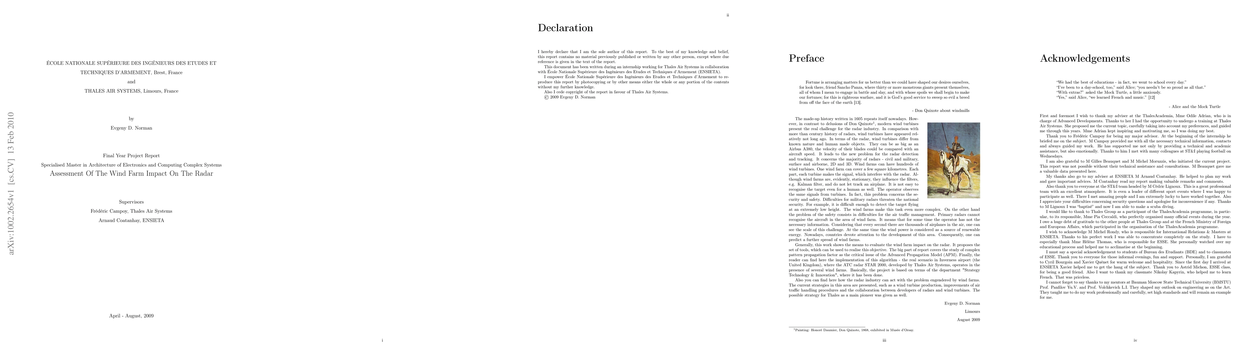 This study shows the means to evaluate the wind farm impact on the radar. It proposes the set of tools, which can be used to realise this objective. The big part of report covers the study of complex pattern propagation factor as the critical issue of the Advanced Propagation Model (APM). Finally, the reader can find here the implementation of this algorithm - the real scenario in Inverness airport (the United Kingdom), where the ATC radar STAR 2000, developed by Thales Air Systems, operates in the presence of several wind farms. Basically, the project is based on terms of the department "Strategy Technology & Innovation", where it has been done. Also you can find here how the radar industry can act with the problem engendered by wind farms. The current strategies in this area are presented, such as a wind turbine production, improvements of air traffic handling procedures and the collaboration between developers of radars and wind turbines. The possible strategy for Thales as a main pioneer was given as well.