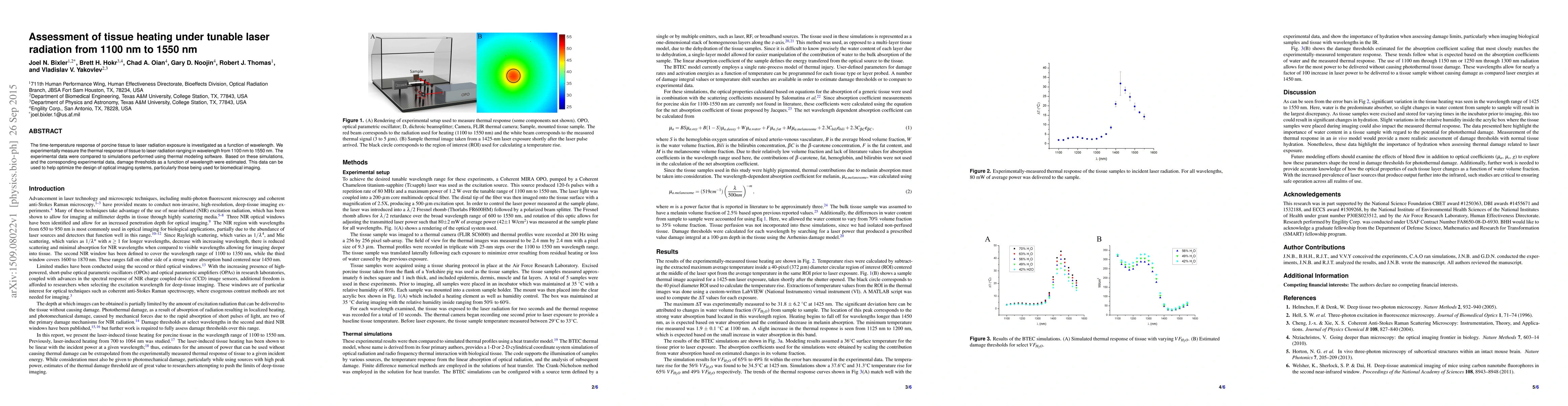 The time-temperature response of porcine tissue to laser radiation exposure is investigated as a function of wavelength. We experimentally measure the thermal response of tissue to laser radiation ranging in wavelength from 1100 nm to 1550 nm. The experimental data were compared to simulations performed using thermal modeling software. Based on these simulations, and the corresponding experimental data, damage thresholds as a function of wavelength were estimated. This data can be used to help optimize the design of optical imaging systems, particularly those being used for biomedical imaging.