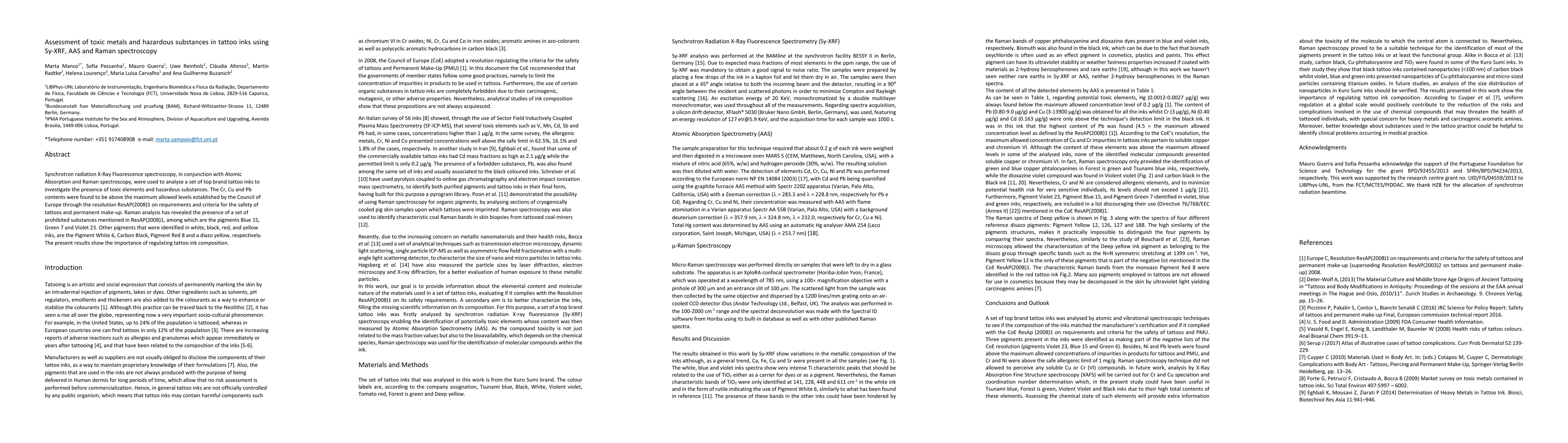 This study assesses toxic metals and hazardous substances in tattoo inks using Sy-XRF, AAS, and Raman spectroscopy, revealing that inks contain Cr, Cu, and Pb above legal limits and prohibited pigments like Blue 15, Green 7, and Violet 23, highlighting the need for stricter regulation.