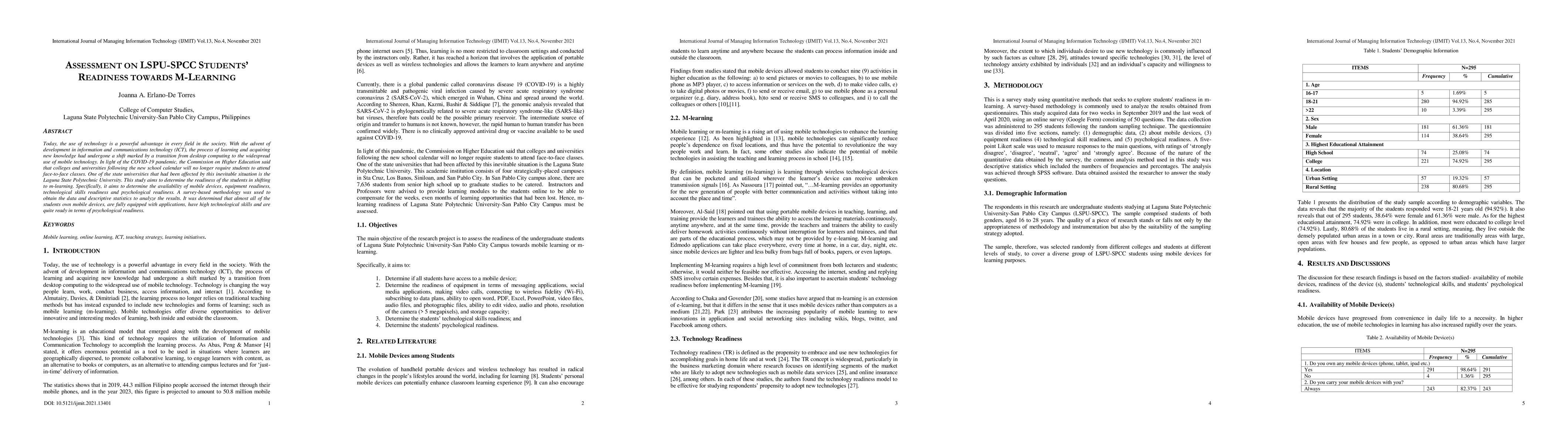This study assesses the readiness of LSPU-SPCC students for m-learning, focusing on mobile device ownership, equipment, technological skills, and psychological readiness. Findings reveal high levels of preparedness among students for the shift to mobile learning.