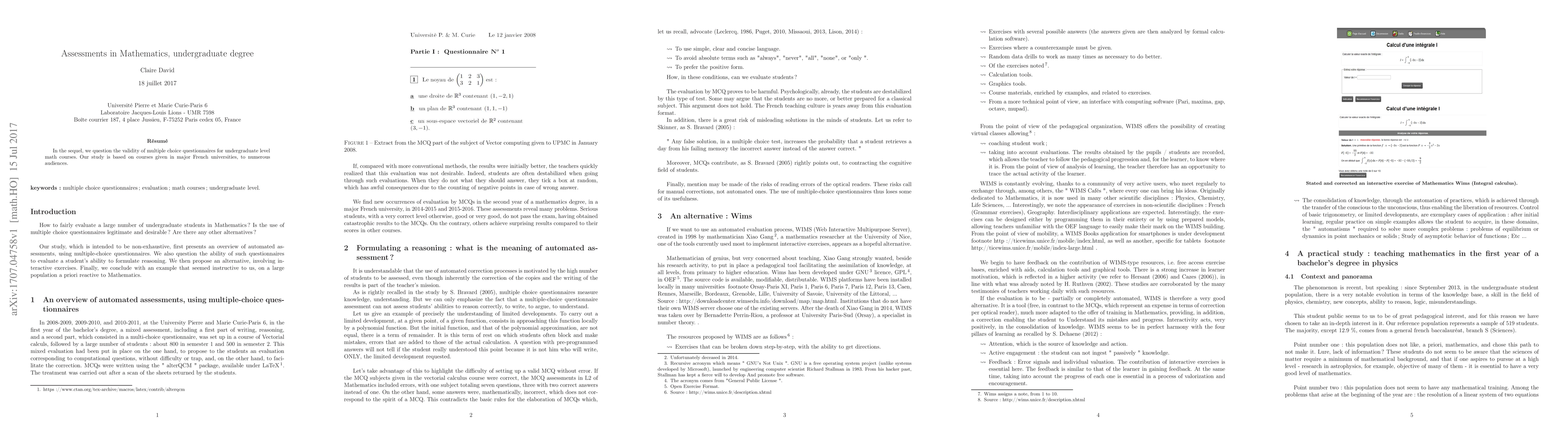 This study evaluates the effectiveness of multiple-choice assessments in undergraduate mathematics courses across major French universities, questioning their validity for accurately measuring student understanding. The research highlights potential limitations and suggests alternative assessment methods.