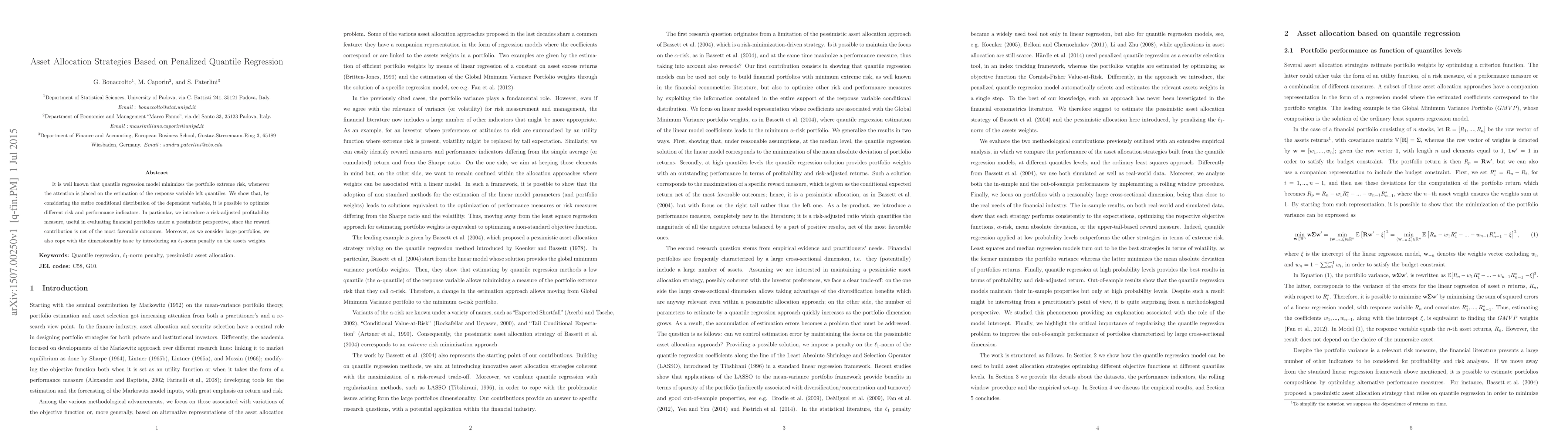 It is well known that quantile regression model minimizes the portfolio extreme risk, whenever the attention is placed on the estimation of the response variable left quantiles. We show that, by considering the entire conditional distribution of the dependent variable, it is possible to optimize different risk and performance indicators. In particular, we introduce a risk-adjusted profitability measure, useful in evaluating financial portfolios under a pessimistic perspective, since the reward contribution is net of the most favorable outcomes. Moreover, as we consider large portfolios, we also cope with the dimensionality issue by introducing an l1-norm penalty on the assets weights.