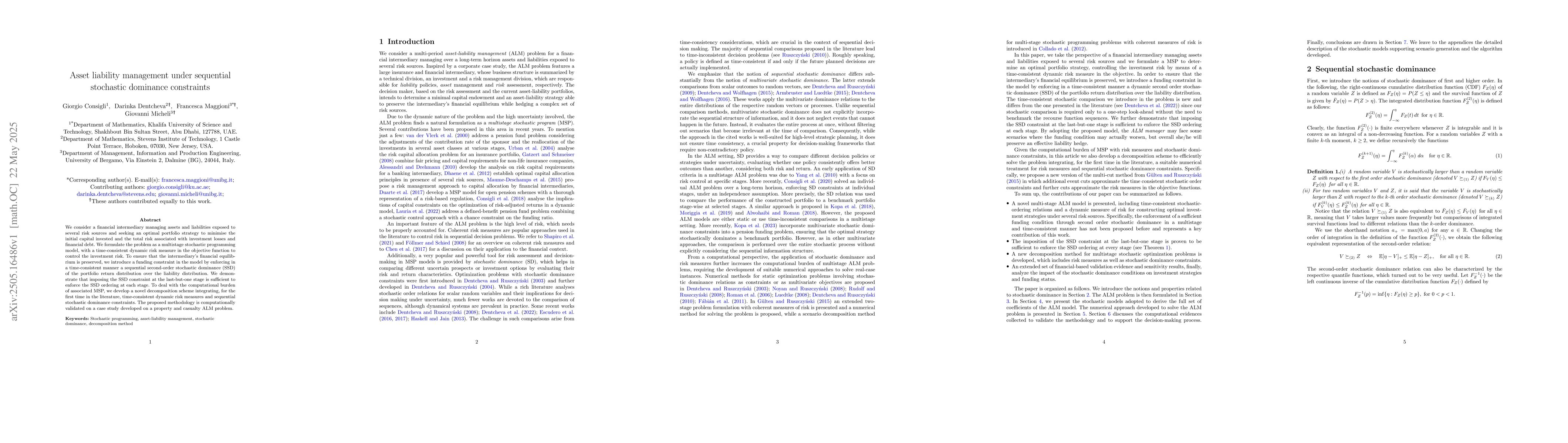 This work is novel as it integrates time-consistent dynamic risk measures and sequential stochastic dominance constraints within a single decomposition scheme for asset liability management, which has not been done before in the literature.