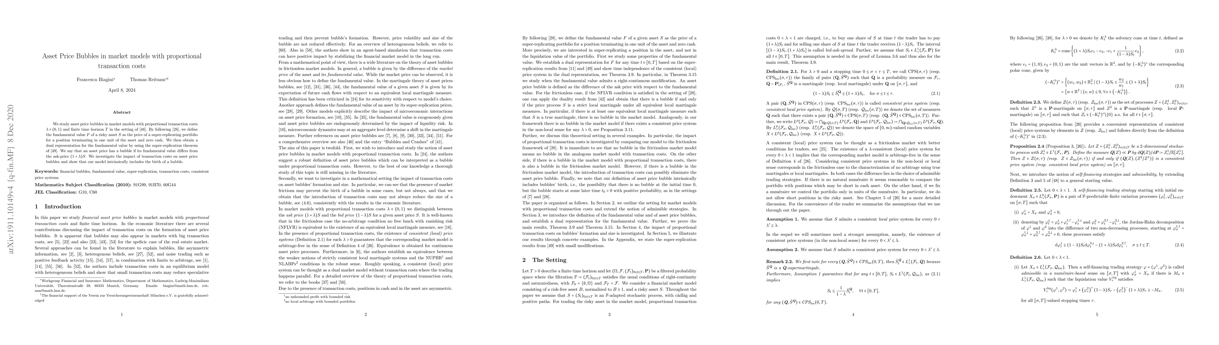 This paper examines asset price bubbles in market models with proportional transaction costs, demonstrating that the model inherently generates bubbles when the fundamental value diverges from the ask-price. The study uses a dual representation for the fundamental value derived from super-replication theory.