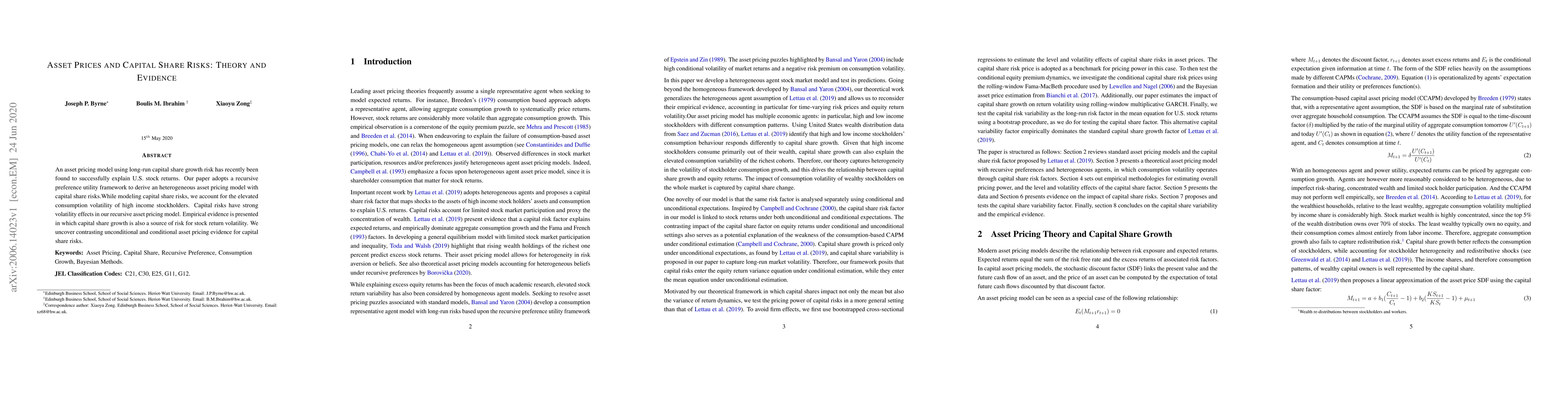 This paper develops a recursive preference utility framework to create a heterogeneous asset pricing model incorporating long-run capital share growth risk, showing it effectively explains U.S. stock returns. Empirical evidence supports capital share growth as a significant risk factor for stock return volatility, with contrasting findings on its unconditional and conditional impacts.