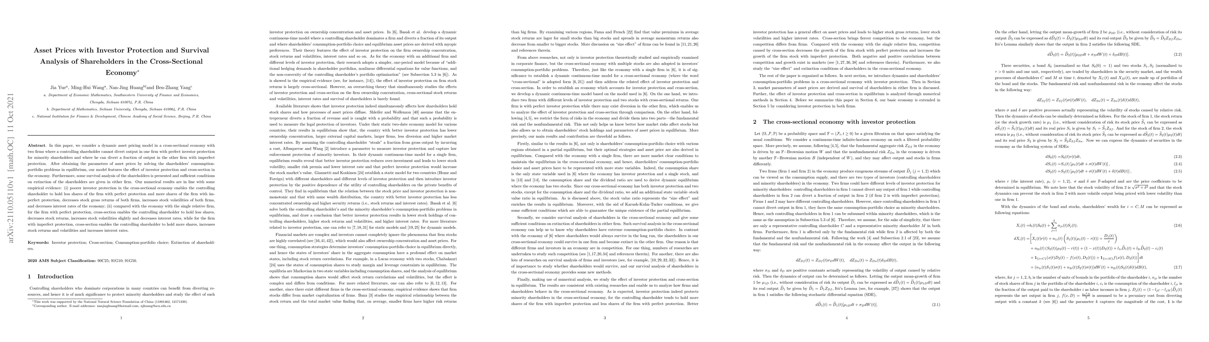 In this paper, we consider a dynamic asset pricing model in a cross-sectional economy with two firms where a controlling shareholder cannot divert output in one firm with perfect investor protection for minority shareholders and where he can divert a fraction of output in the other firm with imperfect protection. After obtaining the parameters of asset prices by solving the shareholders' consumption-portfolio problems in equilibrium, our model features the effect of investor protection and cross-section in the economy. Furthermore, some survival analysis of the shareholders is presented and sufficient conditions on extinction of the shareholders are given in either firm. Our numerical results are in line with some empirical evidence: (i) poorer investor protection in the cross-sectional economy enables the controlling shareholder to hold less shares of the firm with perfect protection and more shares of the firm with imperfect protection, decreases stock gross returns of both firms, increases stock volatilities of both firms, and decreases interest rates of the economy; (ii) compared with the economy with the single relative firm, for the firm with perfect protection, cross-section enables the controlling shareholder to hold less shares, decreases stock returns, increases stock volatilities slightly and decreases interest rates, while for the firm with imperfect protection, cross-section enables the controlling shareholder to hold more shares, increases stock returns and volatilities and increases interest rates.
