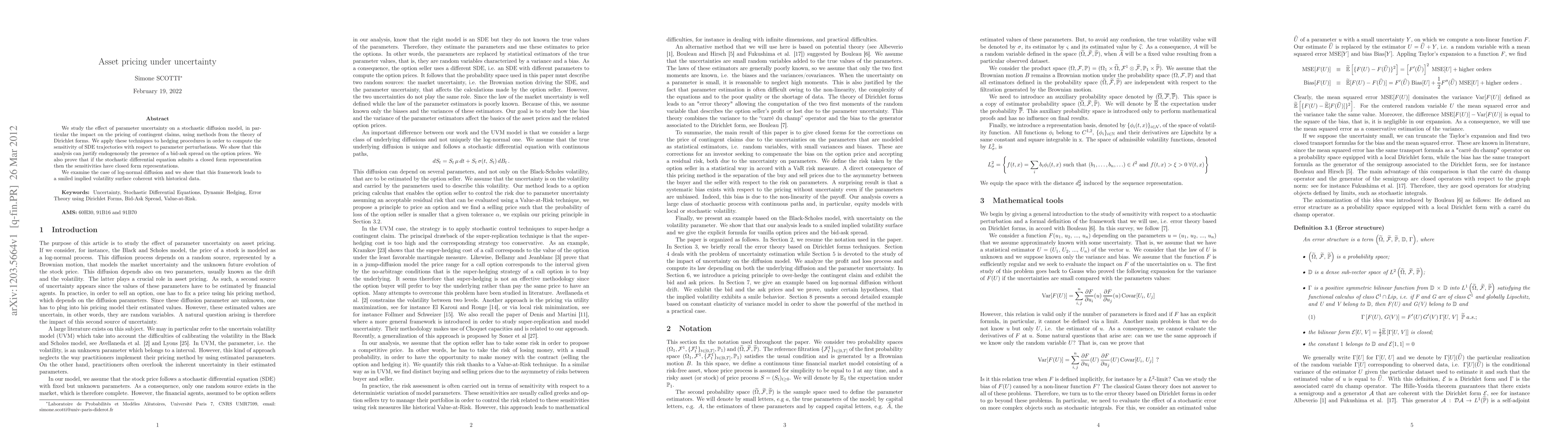 This research explores how uncertainty in parameters affects asset pricing via stochastic diffusion models, focusing on contingent claim pricing. Using Dirichlet form theory, it demonstrates that parameter perturbations impact hedging strategies, justifying option price bid-ask spreads. The study also reveals that closed-form SDEs lead to closed-form sensitivities, and applies this to log-normal diffusion, generating a volatility surface aligned with historical data.