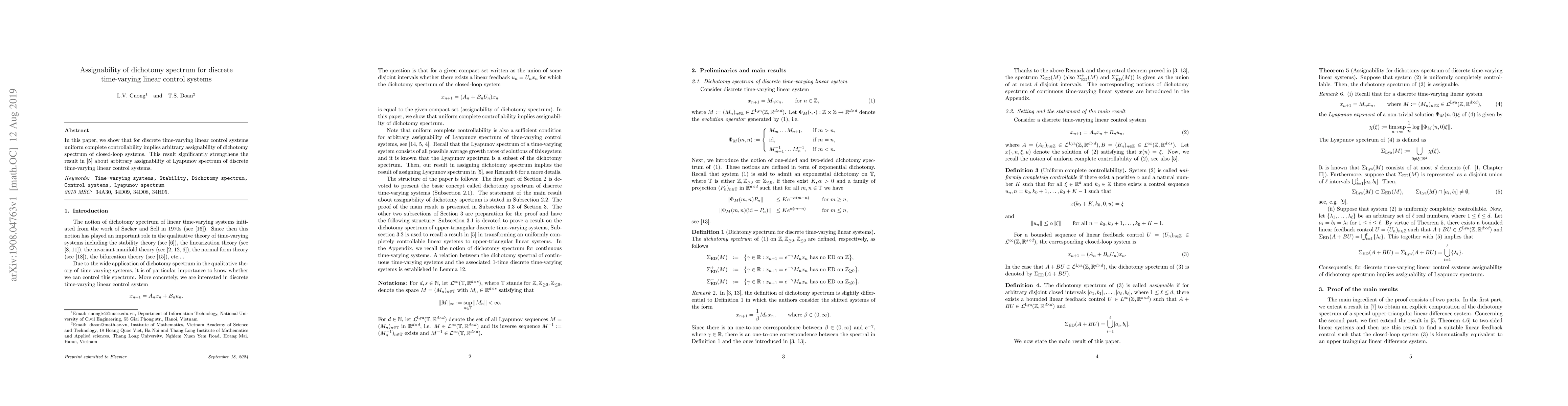 In this paper, we show that for discrete time-varying linear control systems uniform complete controllability implies arbitrary assignability of dichotomy spectrum of closed-loop systems. This result significantly strengthens the result in A. Babiarz et. al. Pole placement theorem for discrete time-varying linear systems.SIAM J. Control Optim. 55 (2017), no. 2, 671-692 about arbitrary assignability of Lyapunov spectrum of discrete time-varying linear control systems.