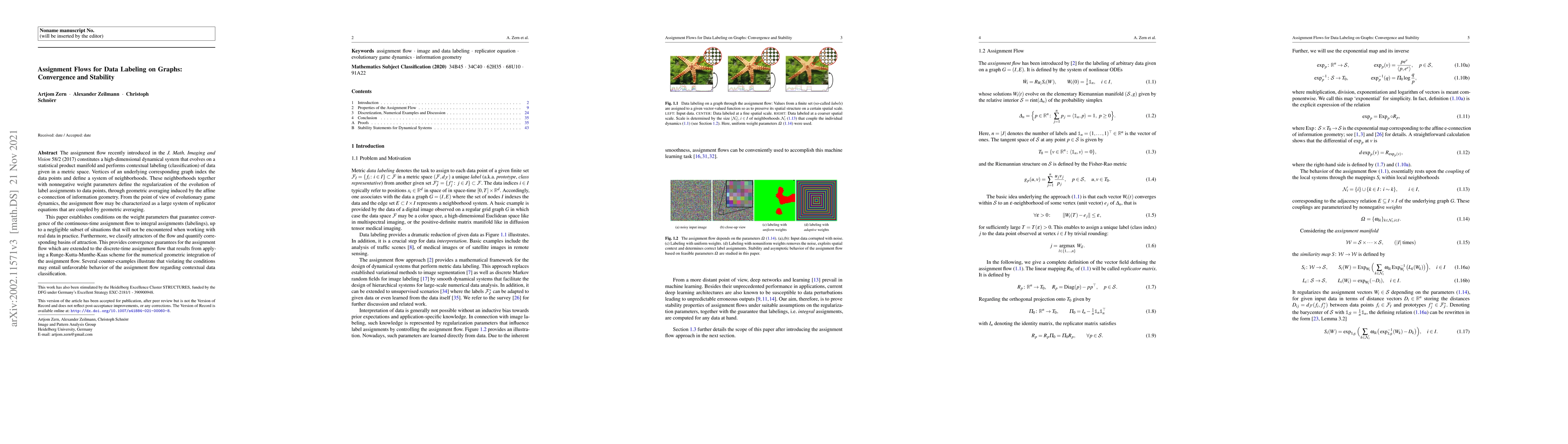 This paper introduces the assignment flow for data labeling on graphs, establishing conditions for its convergence and stability. It guarantees convergence to integral assignments under specified weight parameters, classifies attractors, and quantifies basins of attraction, extending these results to a discrete-time version using numerical integration.