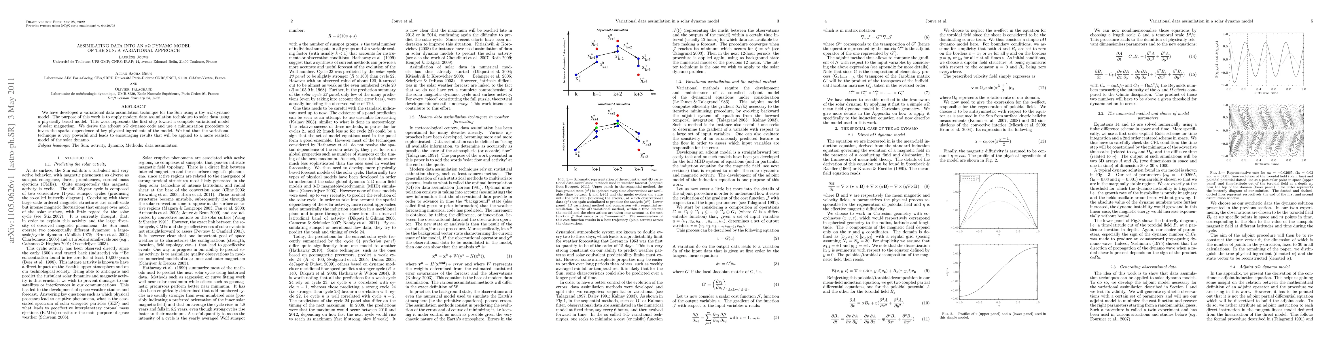 This paper develops a variational data assimilation technique for a toy αΩ dynamo model of the Sun, deriving the adjoint code and using it to invert key physical parameters. The approach shows promising results and lays the groundwork for future applications to more realistic solar dynamo models.