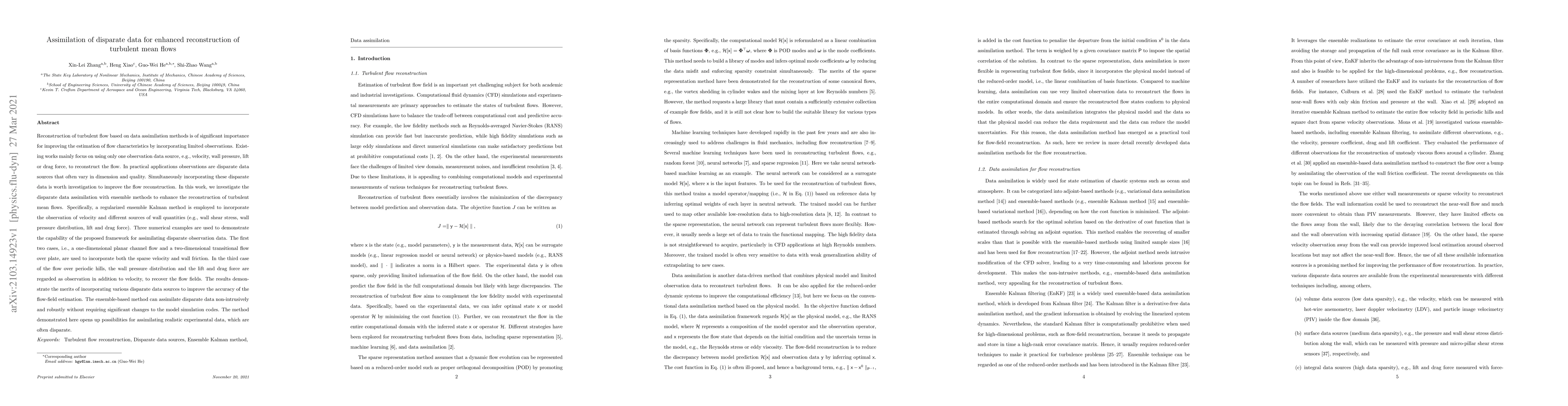 The paper presents a regularized ensemble Kalman filter (REnKF) method for assimilating disparate data sources in turbulent flow reconstruction, enhancing the accuracy of flow-field estimation without significant alterations to existing simulation codes.