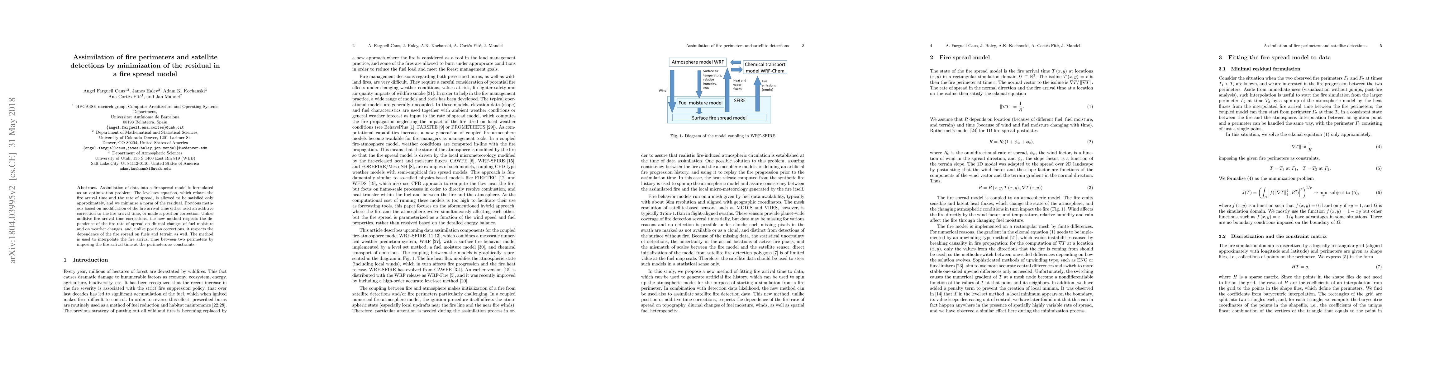 This paper proposes a novel optimization method for assimilating fire perimeters and satellite data into a fire spread model by minimizing the residual between the model's predictions and observed data. The method respects both the fire rate of spread and its dependence on environmental factors, unlike previous additive or positional correction methods.