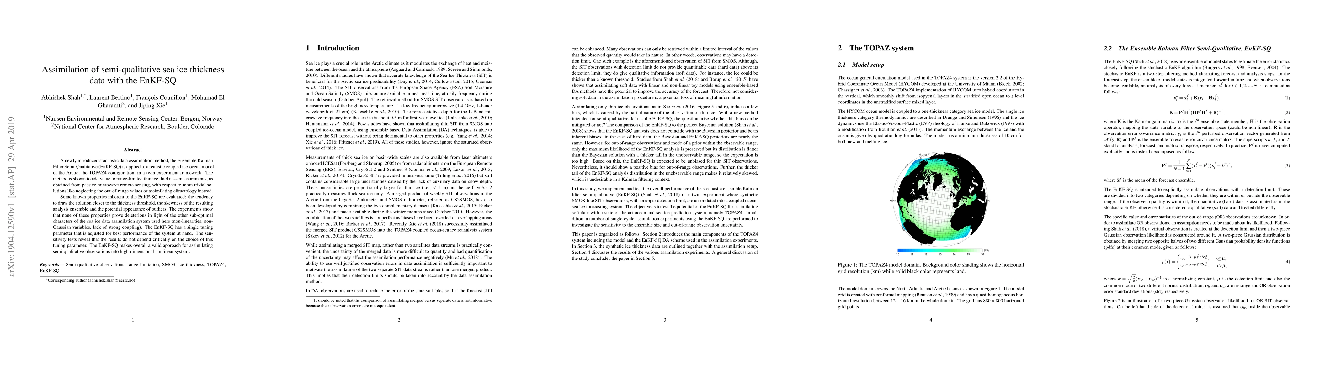 The EnKF-SQ method effectively assimilates semi-qualitative sea ice thickness data into a coupled ice-ocean model, demonstrating improved performance over traditional methods. The method's robustness is shown through its ability to handle inherent properties like threshold drawing and skewness, without compromising overall assimilation quality.