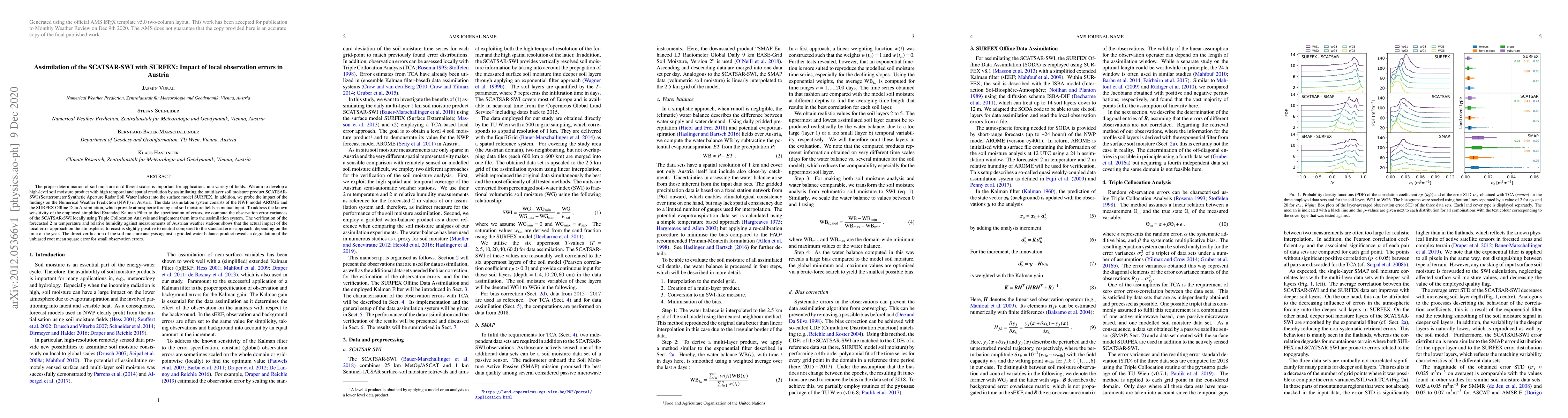 The proper determination of soil moisture on different scales is important for applications in a variety of fields. We aim to develop a high-level soil moisture product with high temporal and spatial resolution by assimilating the multilayer soil moisture product SCATSAR-SWI (Scatterometer Synthetic Aperture Radar Soil Water Index) into the surface model SURFEX. In addition, we probe the impact of the findings on the Numerical Weather Prediction (NWP) in Austria. The data assimilation system consists of the NWP model AROME and the SURFEX Offline Data Assimilation, which provide atmospheric forcing and soil moisture fields as mutual input. To address the known sensitivity of the employed simplified Extended Kalman Filter to the specification of errors, we compute the observation error variances of the SCATSAR-SWI locally using Triple Collocation Analysis and implement them into the assimilation system. The verification of the forecasted 2 m temperature and relative humidity against measurements of Austrian weather stations shows that the actual impact of the local error approach on the atmospheric forecast is slightly positive to neutral compared to the standard error approach, depending on the time of the year. The direct verification of the soil moisture analysis against a gridded water balance product reveals a degradation of the unbiased root mean square error for small observation errors.
