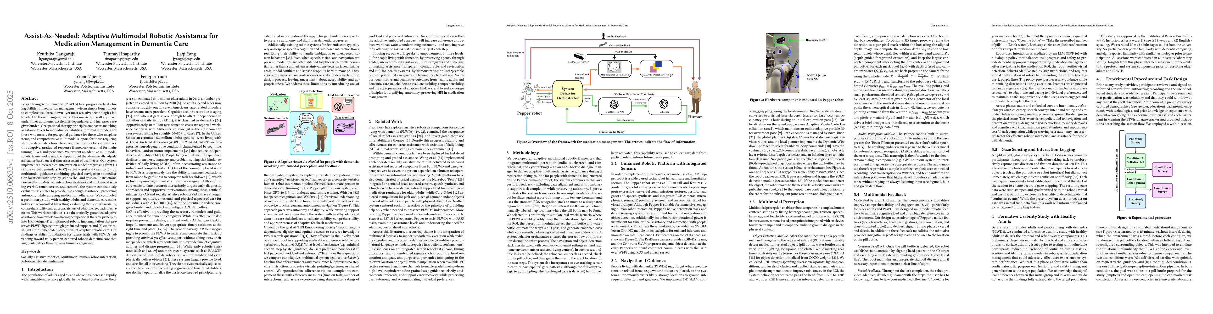 People living with dementia (PLWDs) face progressively declining abilities in medication management-from simple forgetfulness to complete task breakdown-yet most assistive technologies fail to adapt to these changing needs. This one-size-fits-all approach undermines autonomy, accelerates dependence, and increases caregiver burden. Occupational therapy principles emphasize matching assistance levels to individual capabilities: minimal reminders for those who merely forget, spatial guidance for those who misplace items, and comprehensive multimodal support for those requiring step-by-step instruction. However, existing robotic systems lack this adaptive, graduated response framework essential for maintaining PLWD independence. We present an adaptive multimodal robotic framework using the Pepper robot that dynamically adjusts assistance based on real-time assessment of user needs. Our system implements a hierarchical intervention model progressing from (1) simple verbal reminders, to (2) verbal + gestural cues, to (3) full multimodal guidance combining physical navigation to medication locations with step-by-step verbal and gestural instructions. Powered by LLM-driven interaction strategies and multimodal sensing, the system continuously evaluates task states to provide just-enough assistance-preserving autonomy while ensuring medication adherence. We conducted a preliminary study with healthy adults and dementia care stakeholders in a controlled lab setting, evaluating the system's usability, comprehensibility, and appropriateness of adaptive feedback mechanisms. This work contributes: (1) a theoretically grounded adaptive assistance framework translating occupational therapy principles into HRI design, (2) a multimodal robotic implementation that preserves PLWD dignity through graduated support, and (3) empirical insights into stakeholder perceptions of adaptive robotic care.