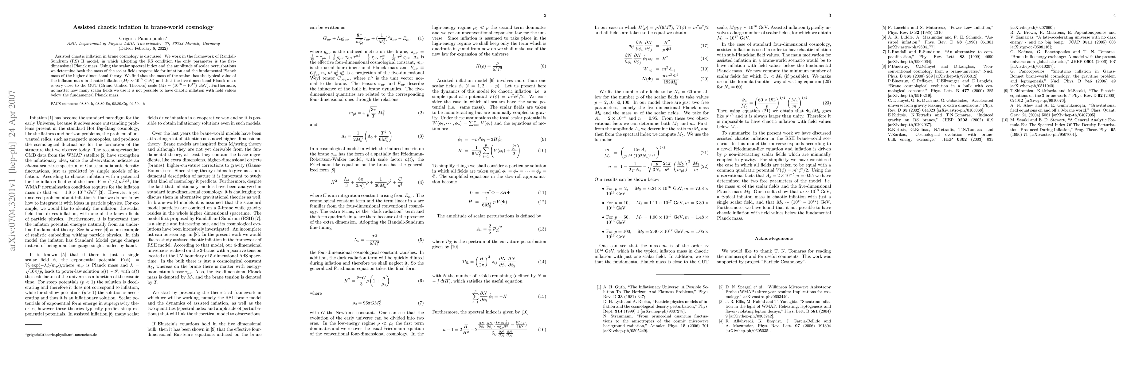 The research used a simplified model of assisted chaotic inflation in the context of brane-world scenarios.