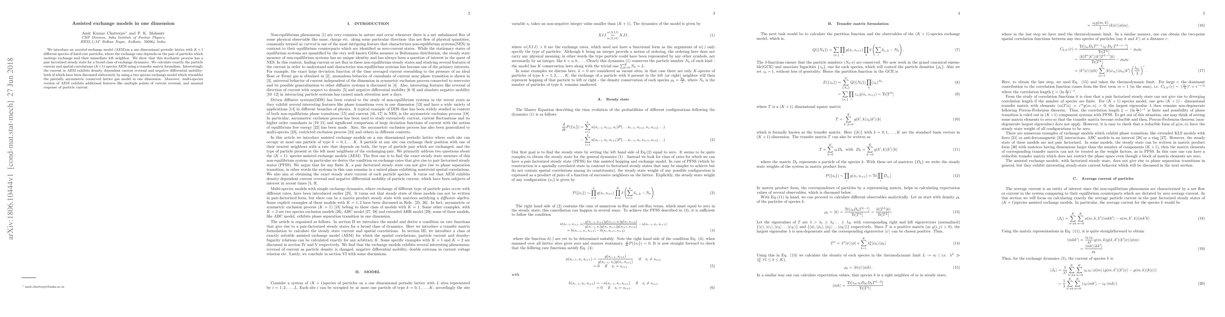 We introduce an assisted exchange model (AEM) on a one dimensional periodic lattice with (K+1) different species of hard core particles, where the exchange rate depends on the pair of particles which undergo exchange and their immediate left neighbor. We show that this stochastic process has a pair factorized steady state for a broad class of exchange dynamics. We calculate exactly the particle current and spatial correlations (K+1)-species AEM using a transfer matrix formalism. Interestingly the current in AEM exhibits density dependent current reversal and negative differential mobility- both of which have been discussed elaborately by using a two species exchange model which resembles the partially asymmetric conserved lattice gas model in one dimension. Moreover, multi-species version of AEM exhibits additional features like multiple points of current reversal, and unusual response of particle current.