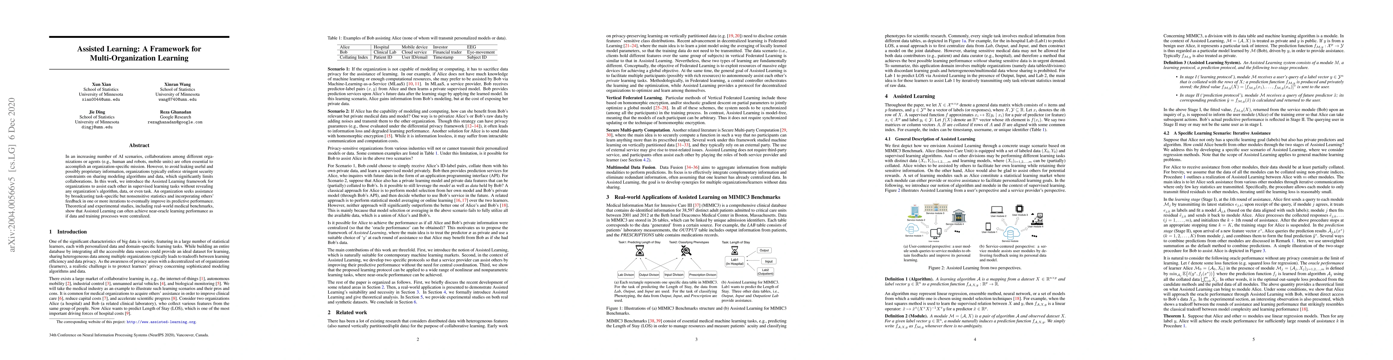 This paper introduces the Assisted Learning framework to enable collaborative learning among organizations without sharing sensitive algorithms or data. Organizations broadcast non-sensitive statistics and incorporate feedback to improve performance, achieving near-optimal results without centralizing data.