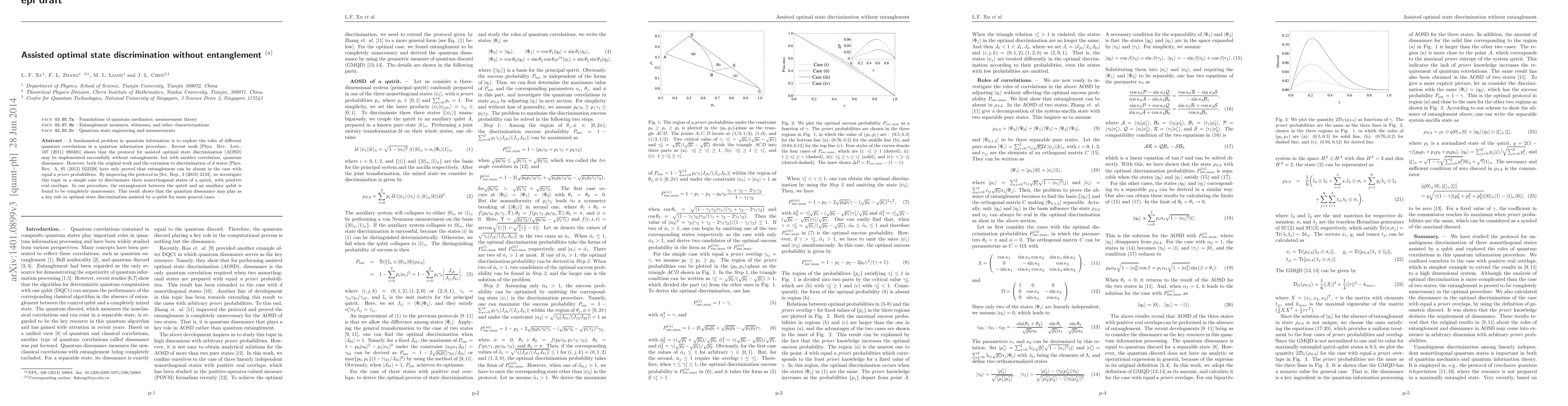 This paper demonstrates that assisted optimal state discrimination (AOSD) can be achieved without entanglement, utilizing quantum dissonance instead. Specifically, the authors show that three nonorthogonal qutrit states can be successfully discriminated without requiring entanglement between the qutrit and an auxiliary qubit, highlighting the potential of quantum dissonance in AOSD.