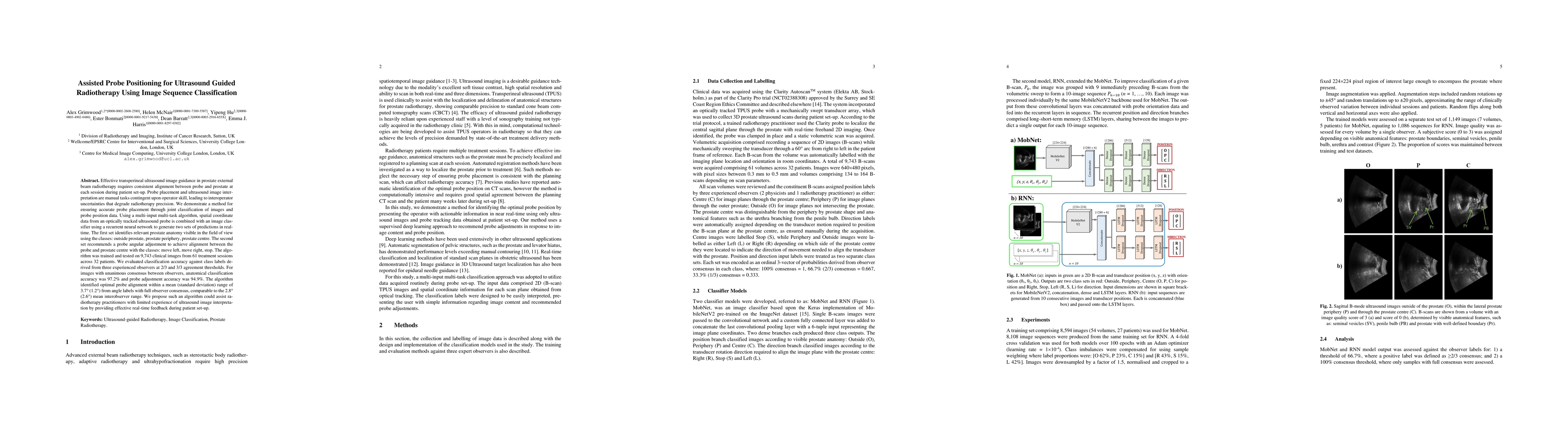 This paper proposes a real-time assisted probe positioning method for ultrasound-guided prostate radiotherapy using image sequence classification. The algorithm combines spatial probe data with image classification to recommend probe adjustments, achieving 97.2% anatomical classification and 94.9% probe adjustment accuracy, comparable to experienced operators.