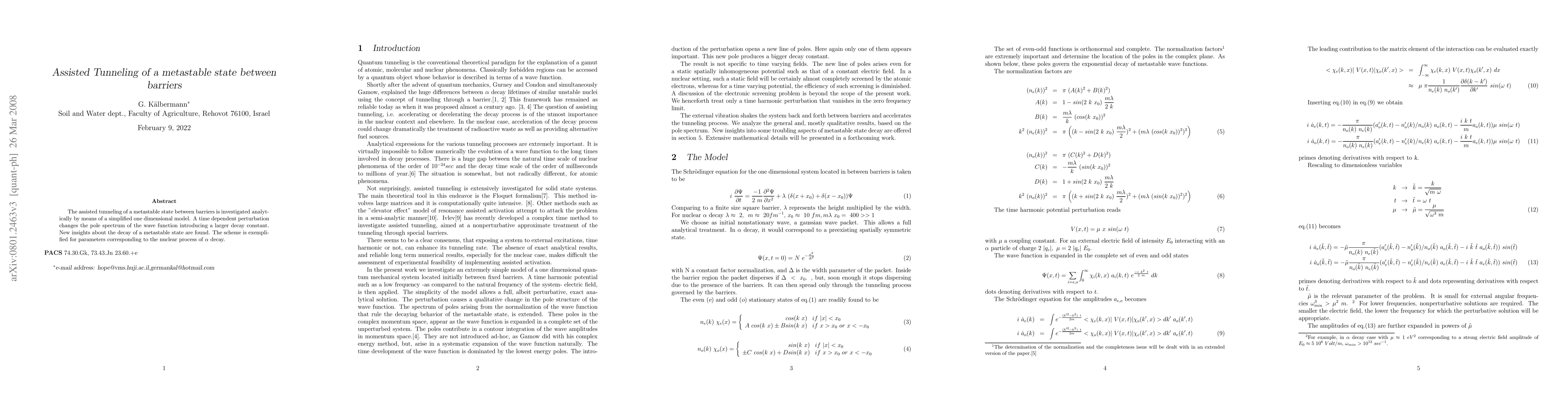 This paper investigates the assisted tunneling of a metastable state between barriers using a simplified one-dimensional model, revealing new insights into the decay process through a time-dependent perturbation that increases the decay constant. The findings are exemplified in the context of nuclear $\alpha$ decay.