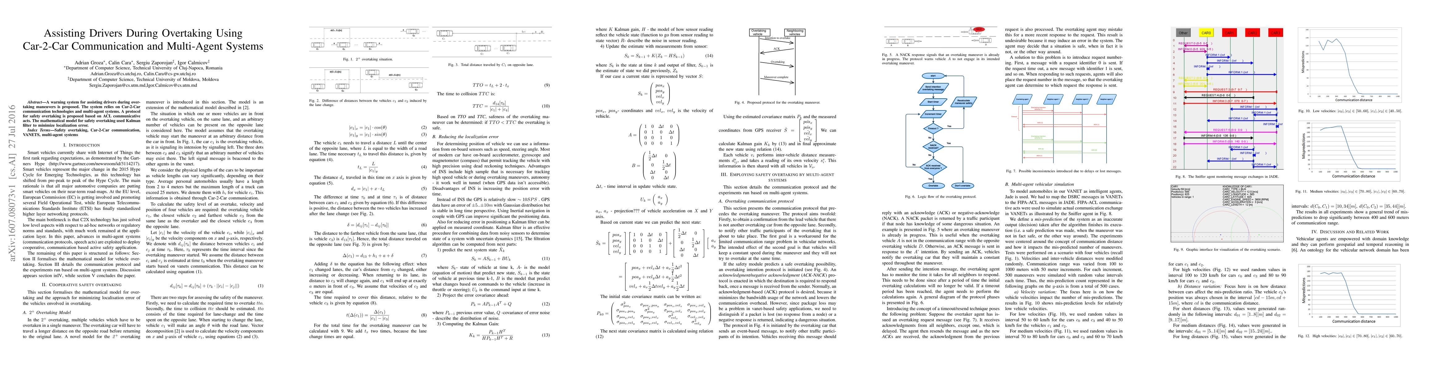 A warning system for assisting drivers during overtaking maneuvers is proposed. The system relies on Car-2-Car communication technologies and multi-agent systems. A protocol for safety overtaking is proposed based on ACL communicative acts. The mathematical model for safety overtaking used Kalman filter to minimize localization error.