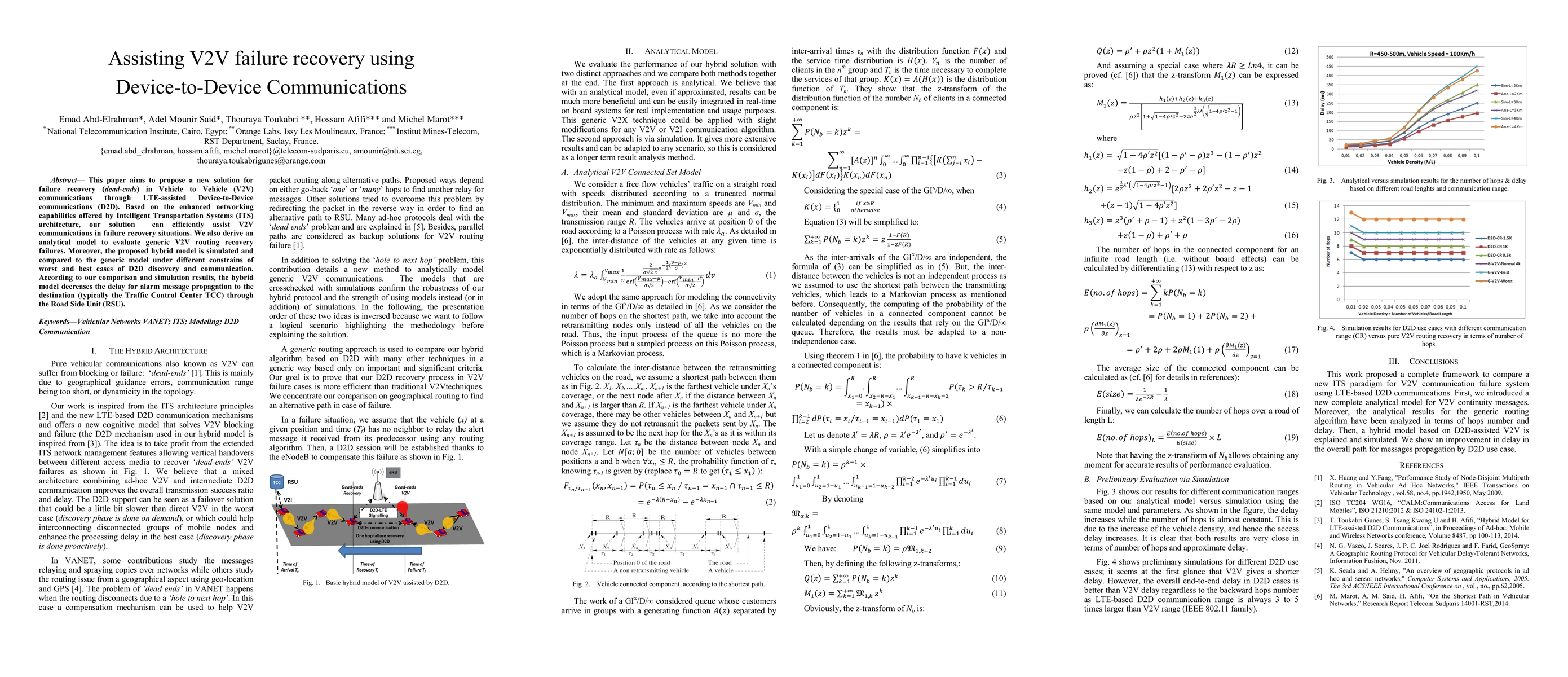 This paper aims to propose a new solution for failure recovery (dead-ends) in Vehicle to Vehicle (V2V) communications through LTE-assisted Device-to-Device communications (D2D). Based on the enhanced networking capabilities offered by Intelligent Transportation Systems (ITS) architecture, our solution can efficiently assist V2V communications in failure recovery situations. We also derive an analytical model to evaluate generic V2V routing recovery failures. Moreover, the proposed hybrid model is simulated and compared to the generic model under different constrains of worst and best cases of D2D discovery and communication. According to our comparison and simulation results, the hybrid model decreases the delay for alarm message propagation to the destination (typically the Traffic Control Center TCC) through the Road Side Unit (RSU)