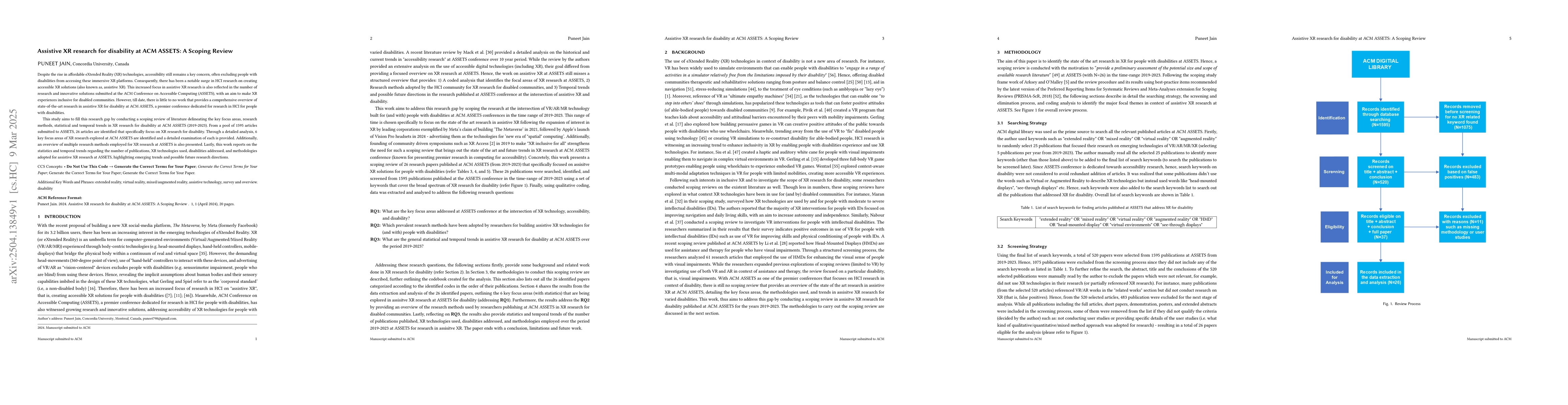 This scoping review analyzed 26 articles from ACM ASSETS (2019-2023) focusing on assistive XR research for disability, employing qualitative, quantitative, and mixed-methods approaches.