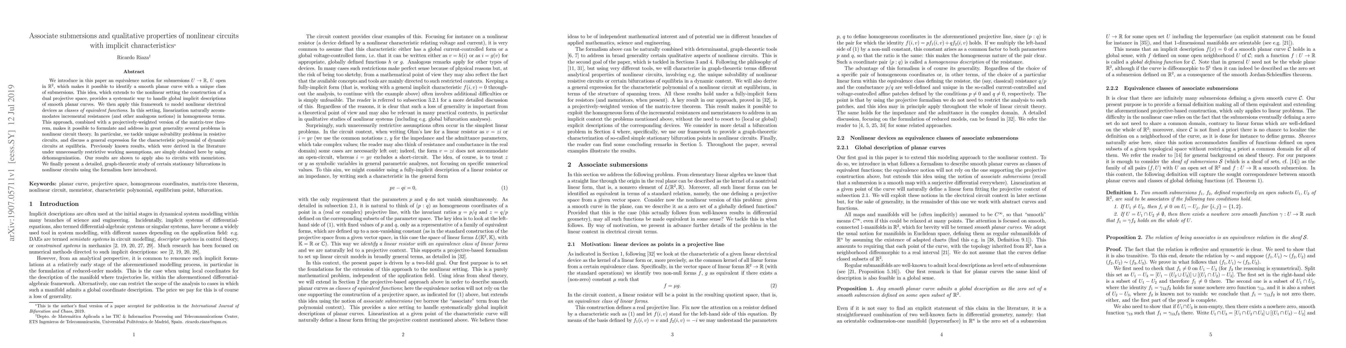 We introduce in this paper an equivalence notion for submersions $U \to \R$, $U$ open in $\R^2$, which makes it possible to identify a smooth planar curve with a unique class of submersions. This idea, which extends to the nonlinear setting the construction of a dual projective space, provides a systematic way to handle global implicit descriptions of smooth planar curves. We then apply this framework to model nonlinear electrical devices as {\em classes of equivalent functions}. In this setting, linearization naturally accommodates incremental resistances (and other analogous notions) in homogeneous terms. This approach, combined with a projectively-weighted version of the matrix-tree theorem, makes it possible to formulate and address in great generality several problems in nonlinear circuit theory. In particular, we tackle unique solvability problems in resistive circuits, and discuss a general expression for the characteristic polynomial of dynamic circuits at equilibria. Previously known results, which were derived in the literature under unnecessarily restrictive working assumptions, are simply obtained here by using dehomogenization. Our results are shown to apply also to circuits with memristors. We finally present a detailed, graph-theoretic study of certain stationary bifurcations in nonlinear circuits using the formalism here introduced.