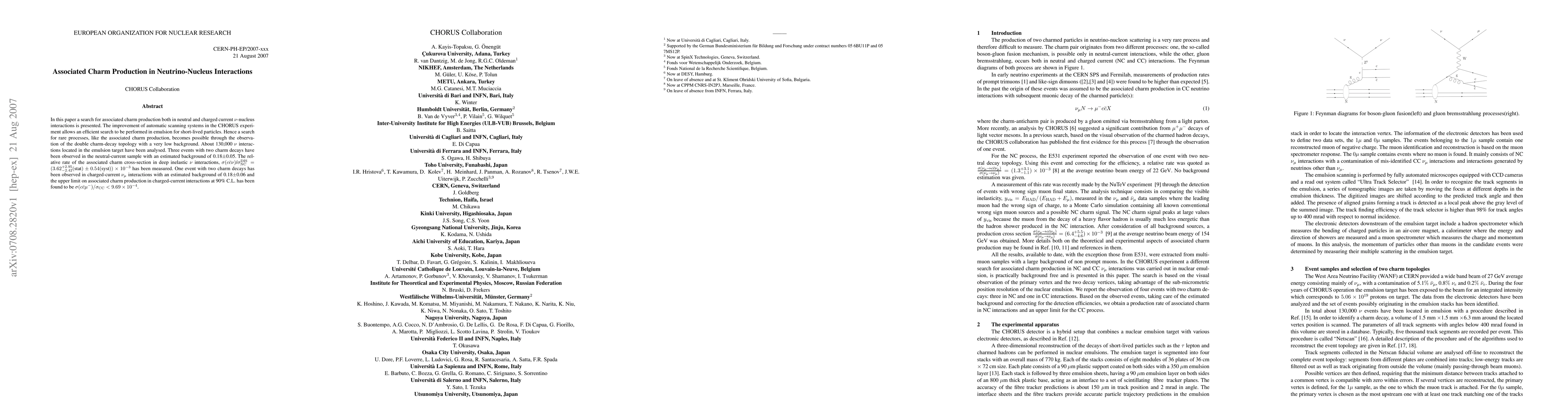 This paper reports on the search for associated charm production in both neutral and charged current neutrino-nucleus interactions using the CHORUS experiment. Three events with double charm decays were observed in neutral-current interactions, with a relative charm cross-section ratio of $(3.62^{+2.95}_{-2.42}({stat})\pm 0.54({syst}))\times 10^{-3}$. One event was observed in charged-current interactions, establishing an upper limit on the associated charm production rate.