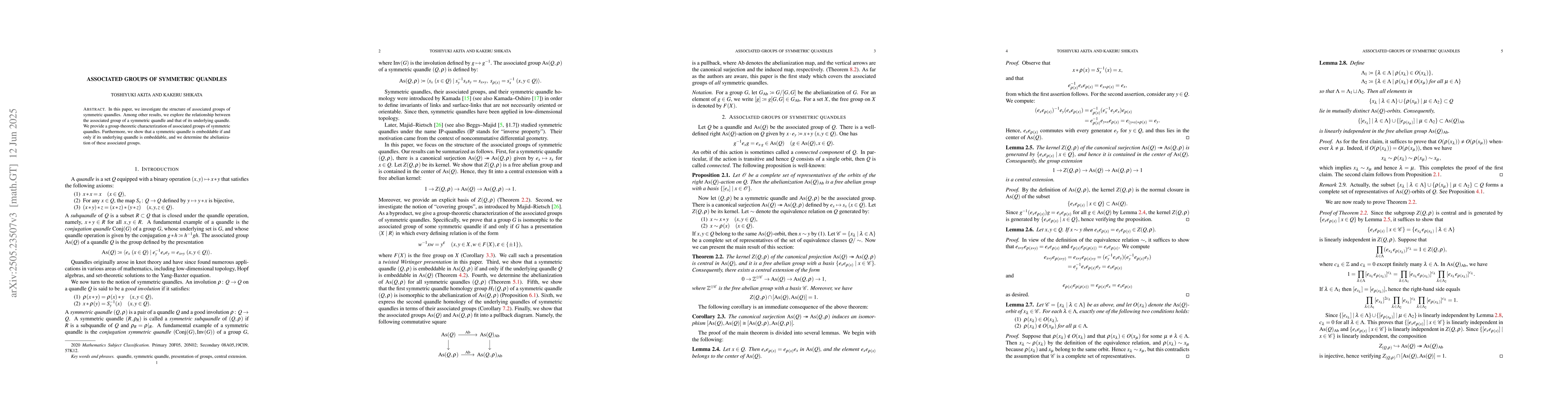 The paper introduces a detailed group-theoretic characterization of associated groups of symmetric quandles and proves crucial embedding properties, extending previous work on involutive quandles.