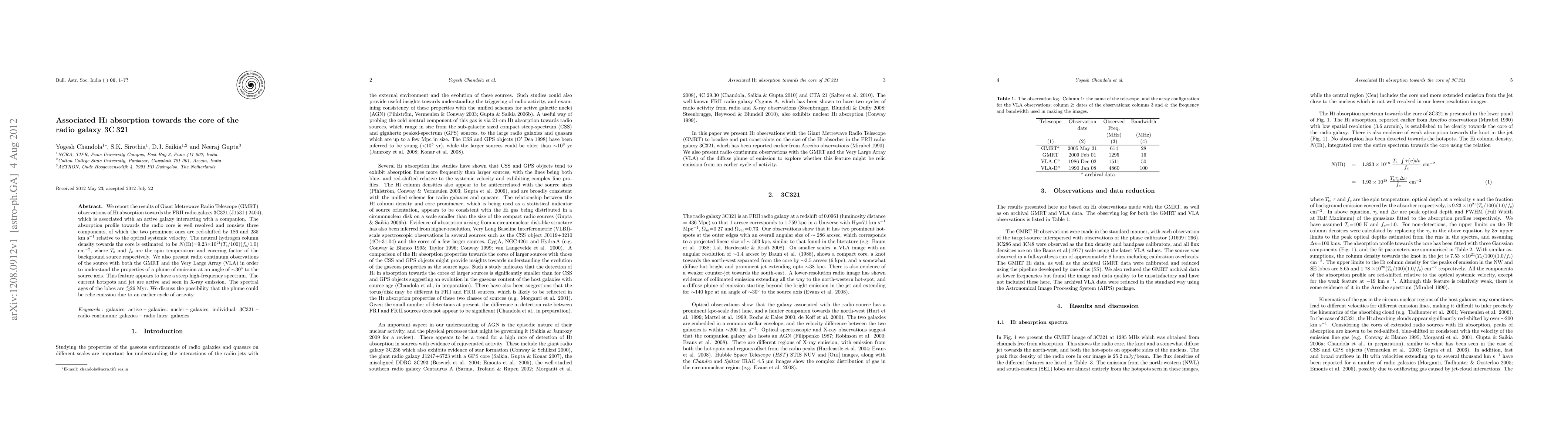 We report the results of Giant Metrewave Radio Telescope (GMRT) observations of H{\sc i} absorption towards the FRII radio galaxy 3C321 (J1531+2404), which is associated with an active galaxy interacting with a companion. The absorption profile towards the radio core is well resolved and consists three components, of which the two prominent ones are red-shifted by 186 and 235 km s$^{-1}$ relative to the optical systemic velocity. The neutral hydrogen column density towards the core is estimated to be $N$(H{\sci})=9.23$\times10^{21}$(${T}_{\rm s}$/100)($f_{c}$/1.0) cm$^{-2}$, where ${T}_{\rm s}$ and $f_c$ are the spin temperature and covering factor of the background source respectively. We also present radio continuum observations of the source with both the GMRT and the Very Large Array (VLA) in order to understand the properties of a plume of emission at an angle of $\sim30^\circ$ to the source axis. This feature appears to have a steep high-frequency spectrum. The current hotspots and jet are active and seen in X-ray emission. The spectral ages of the lobes are $\lapp$26 Myr. We discuss the possibility that the plume could be relic emission due to an earlier cycle of activity.