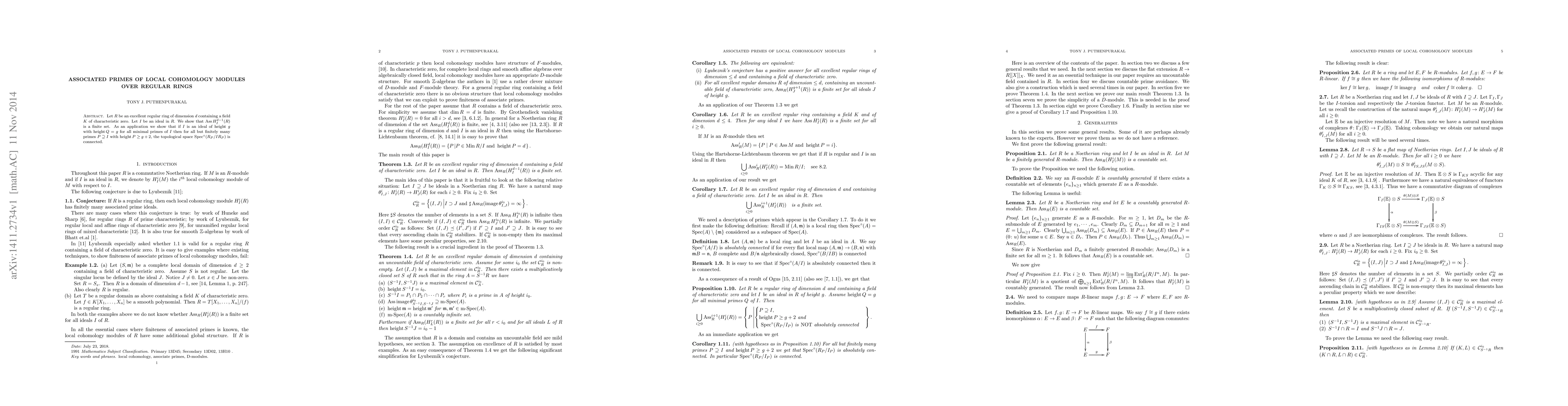 Let $R$ be an excellent regular ring of dimension $d$ containing a field $K$ of characteristic zero. Let $I$ be an ideal in $R$. We show that $Ass \ H^{d-1}_I(R)$ is a finite set. As an application we show that if $I$ is an ideal of height $g$ with $height \ Q = g$ for all minimal primes of $I$ then for all but finitely many primes $P \supseteq I$ with $height \ P \geq g +2$, the topological space $Spec^\circ(R_P/IR_P)$ is connected.
