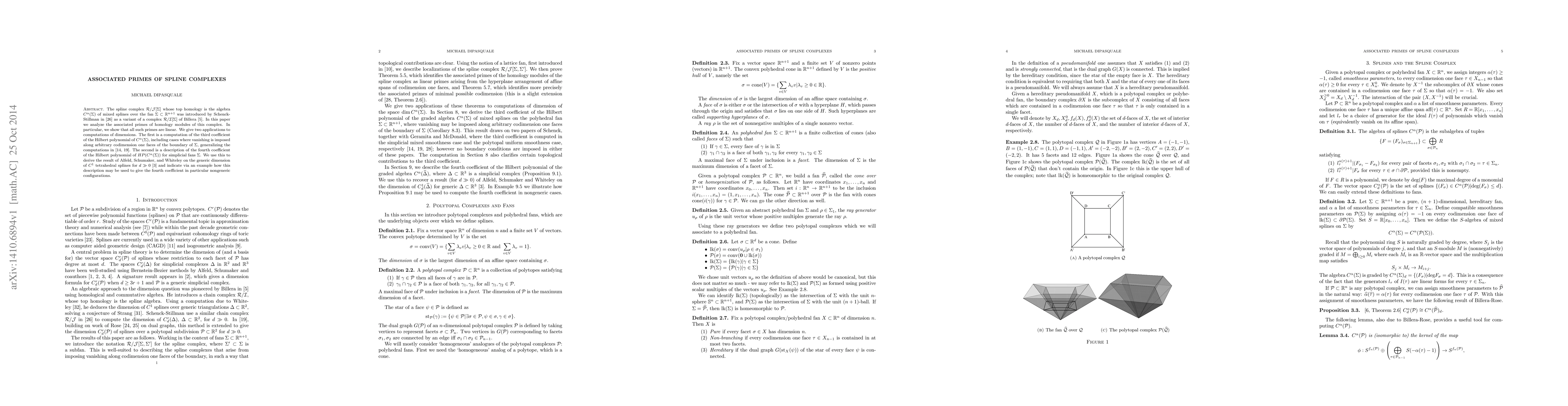 Researchers analyzed the associated primes of homology modules of a spline complex, finding that they are linear and deriving implications for computing dimensions and Hilbert polynomial coefficients.